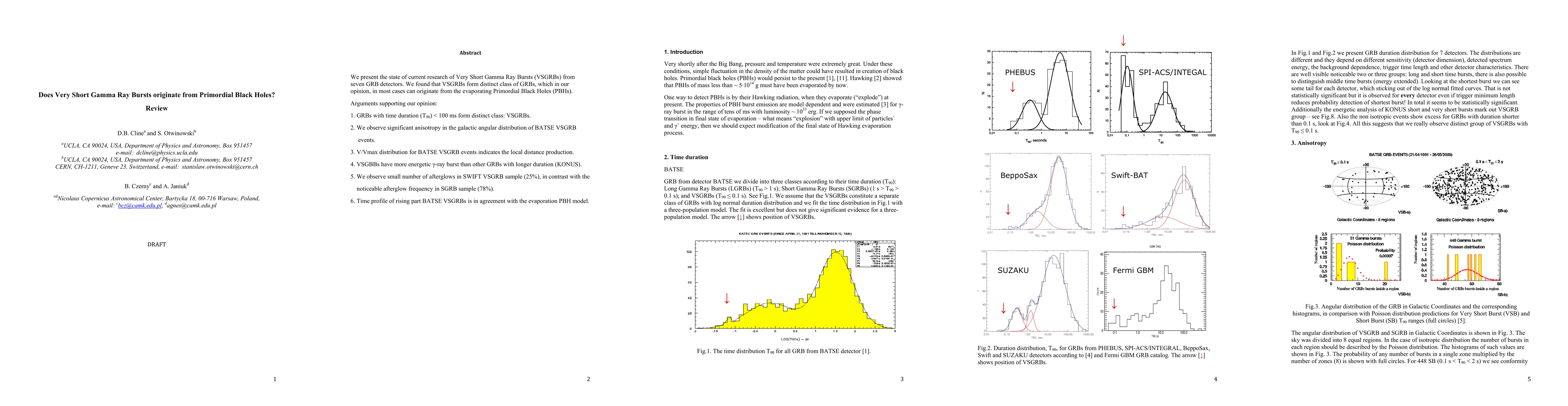 The research analyzes Very Short Gamma Ray Bursts (VSGRBs) from seven GRB detectors, identifying them as a distinct class with T90 < 100 ms, potentially originating from Primordial Black Holes (PBHs). The study examines duration distribution, angular anisotropy, V/Vmax distribution, energy analysis, afterglow frequency, and time profile of rising parts.
