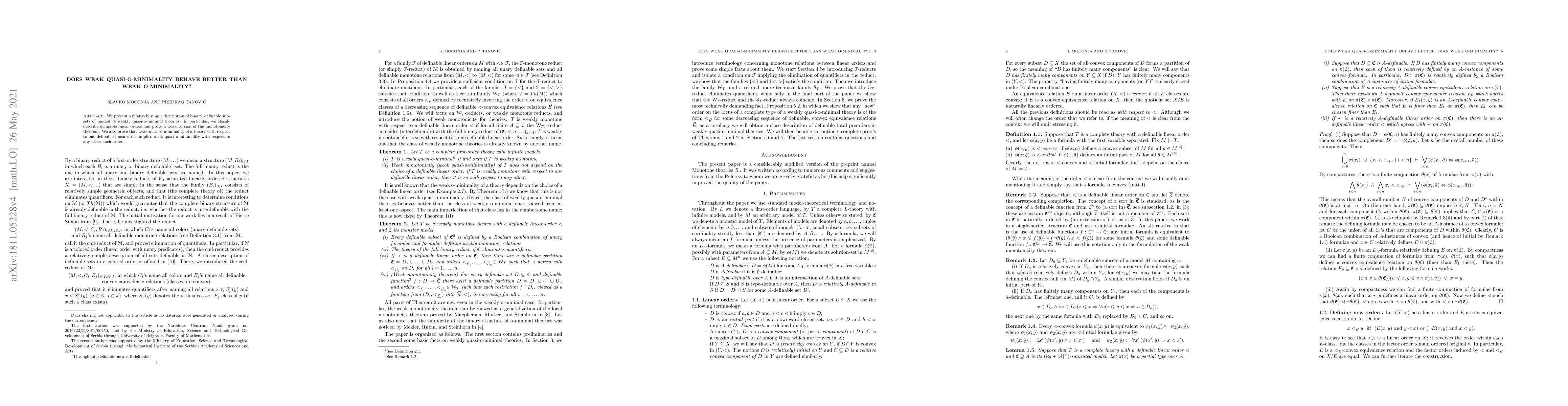 The paper introduces and proves properties related to weak quasi-o-minimality, particularly focusing on definable linear orders and monotonicity, extending the understanding of o-minimal theories.