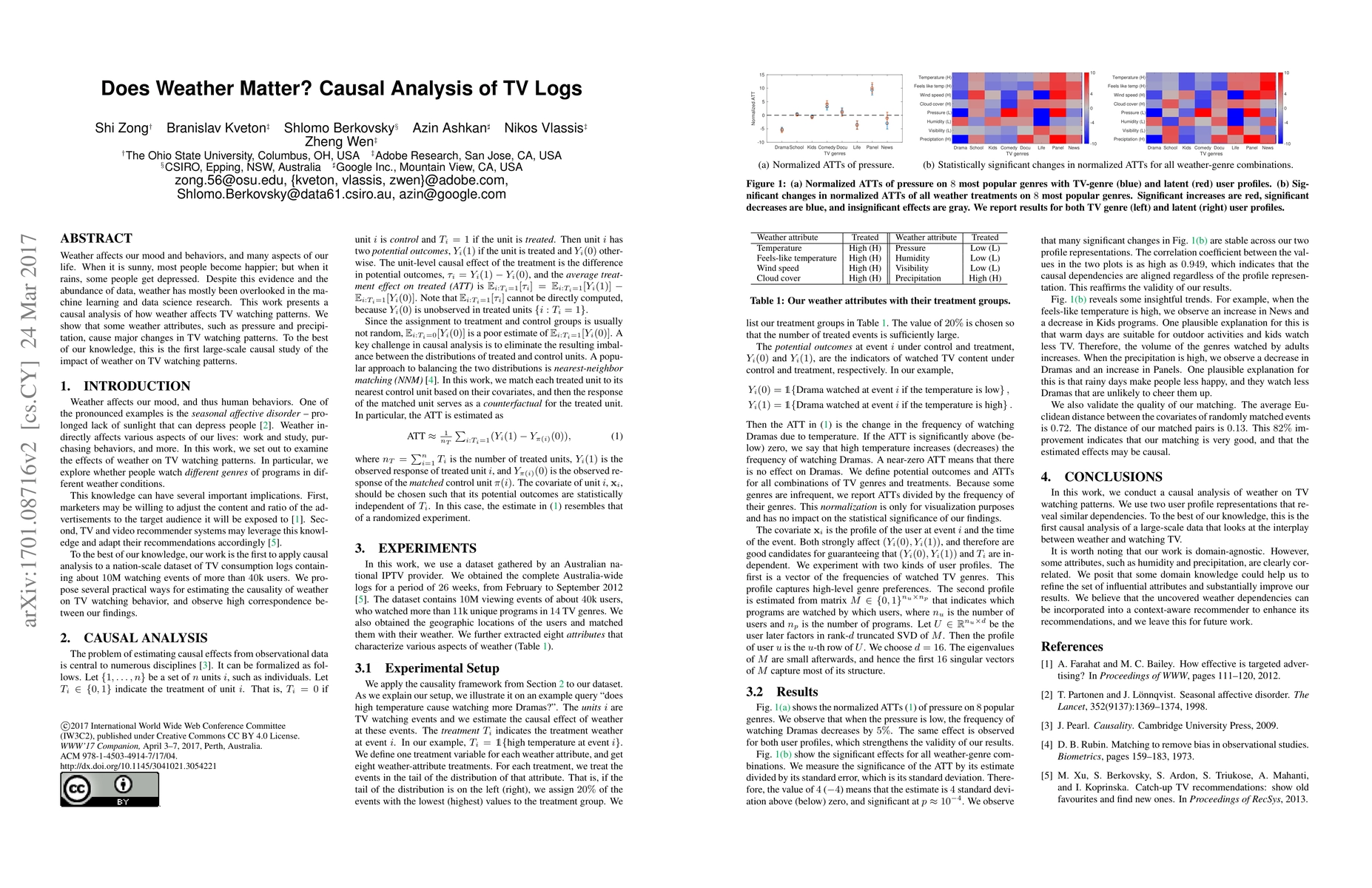 This study investigates the causal relationship between weather conditions and TV viewing patterns, revealing that weather attributes like pressure and precipitation significantly influence viewing habits. This is the first large-scale causal analysis of weather's impact on TV watching, highlighting its often overlooked influence.