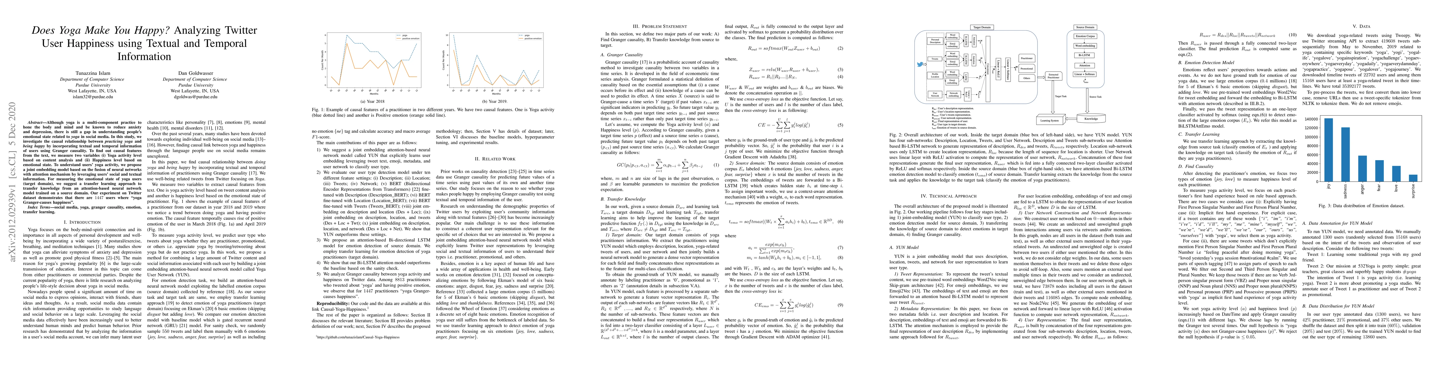 Although yoga is a multi-component practice to hone the body and mind and be known to reduce anxiety and depression, there is still a gap in understanding people's emotional state related to yoga in social media. In this study, we investigate the causal relationship between practicing yoga and being happy by incorporating textual and temporal information of users using Granger causality. To find out causal features from the text, we measure two variables (i) Yoga activity level based on content analysis and (ii) Happiness level based on emotional state. To understand users' yoga activity, we propose a joint embedding model based on the fusion of neural networks with attention mechanism by leveraging users' social and textual information. For measuring the emotional state of yoga users (target domain), we suggest a transfer learning approach to transfer knowledge from an attention-based neural network model trained on a source domain. Our experiment on Twitter dataset demonstrates that there are 1447 users where "yoga Granger-causes happiness".