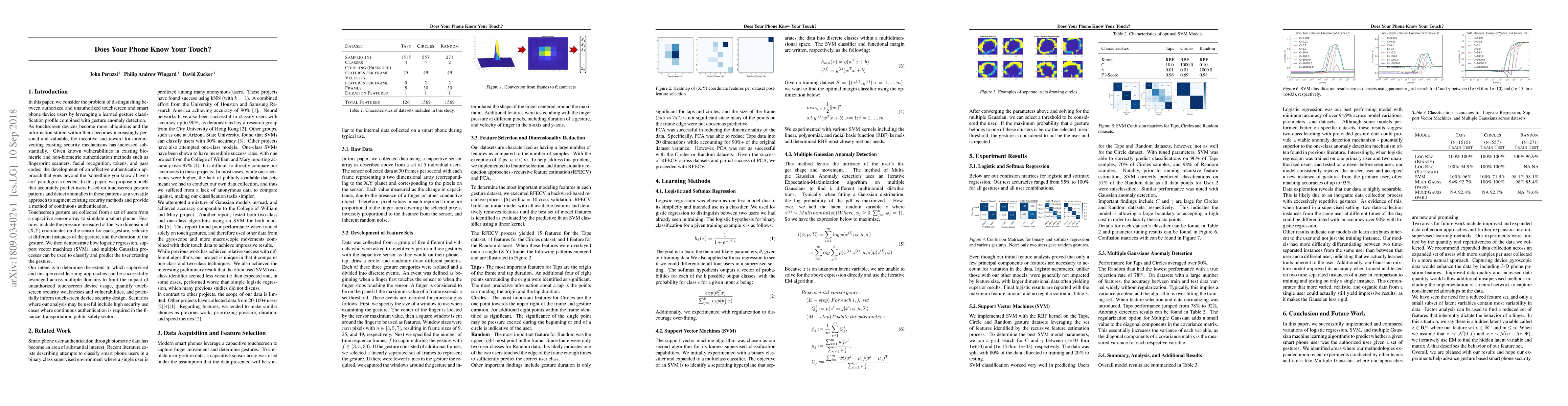 This paper explores supervised techniques for continuous anomaly detection from biometric touch screen data. A capacitive sensor array used to mimic a touch screen as used to collect touch and swipe gestures from participants. The gestures are recorded over fixed segments of time, with position and force measured for each gesture. Support Vector Machine, Logistic Regression, and Gaussian mixture models were tested to learn individual touch patterns. Test results showed true negative and true positive scores of over 95% accuracy for all gesture types, with logistic regression models far outperforming the other methods. A more expansive and varied data collection over longer periods of time is needed to determine pragmatic usage of these results.