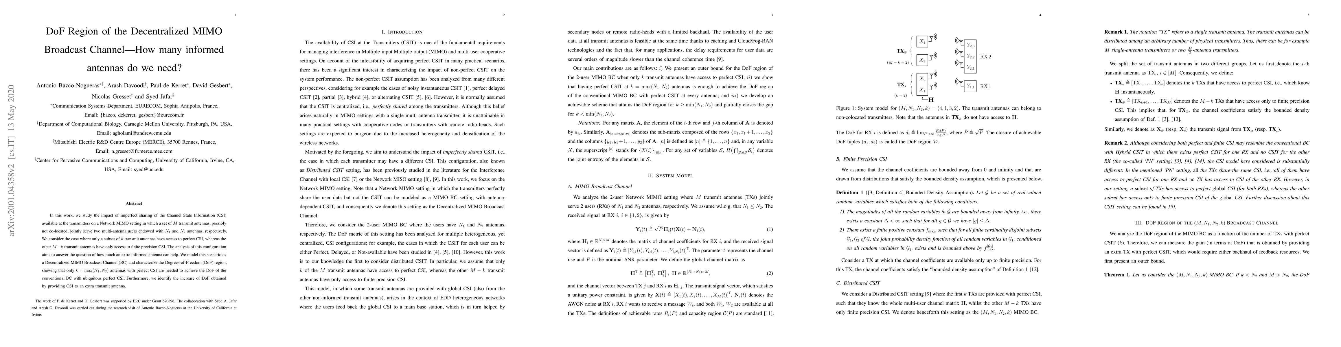 In this work, we study the impact of imperfect sharing of the Channel State Information (CSI) available at the transmitters on a Network MIMO setting in which a set of $M$ transmit antennas, possibly not co-located, jointly serve two multi-antenna users endowed with $N_1$ and $N_2$ antennas, respectively. We consider the case where only a subset of $k$ transmit antennas have access to perfect CSI, whereas the other $M-k$ transmit antennas have only access to finite precision CSI. The analysis of this configuration aims to answer the question of how much an extra informed antenna can help. We model this scenario as a Decentralized MIMO Broadcast Channel (BC) and characterize the Degrees-of-Freedom (DoF) region, showing that only $k=\max(N_1,N_2)$ antennas with perfect CSI are needed to achieve the DoF of the conventional BC with ubiquitous perfect CSI. Furthermore, we identify the increase of DoF obtained by providing CSI to an extra transmit antenna.