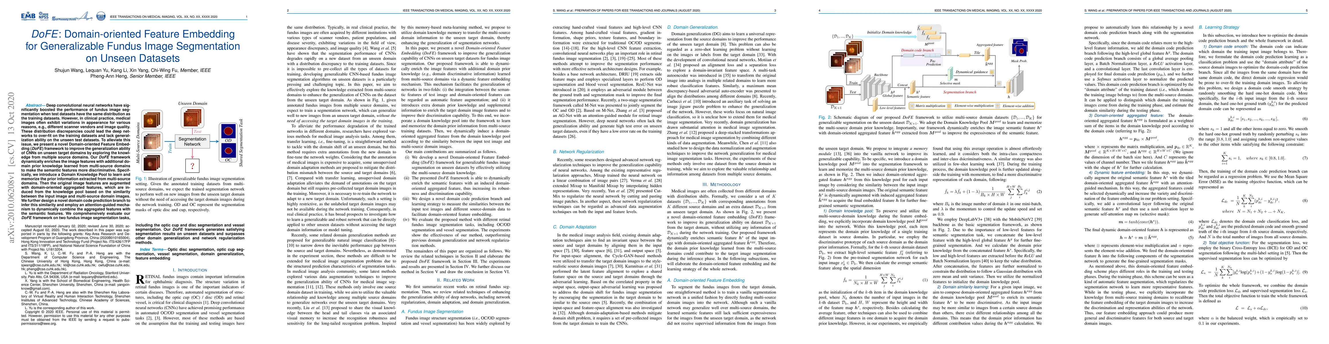 The DoFE framework enhances the generalization ability of CNNs for fundus image segmentation by dynamically embedding domain-specific features from multiple source domains, improving performance on unseen test datasets. The method uses a Domain Knowledge Pool and an attention-guided mechanism to combine enriched features, achieving better results than other domain generalization techniques.