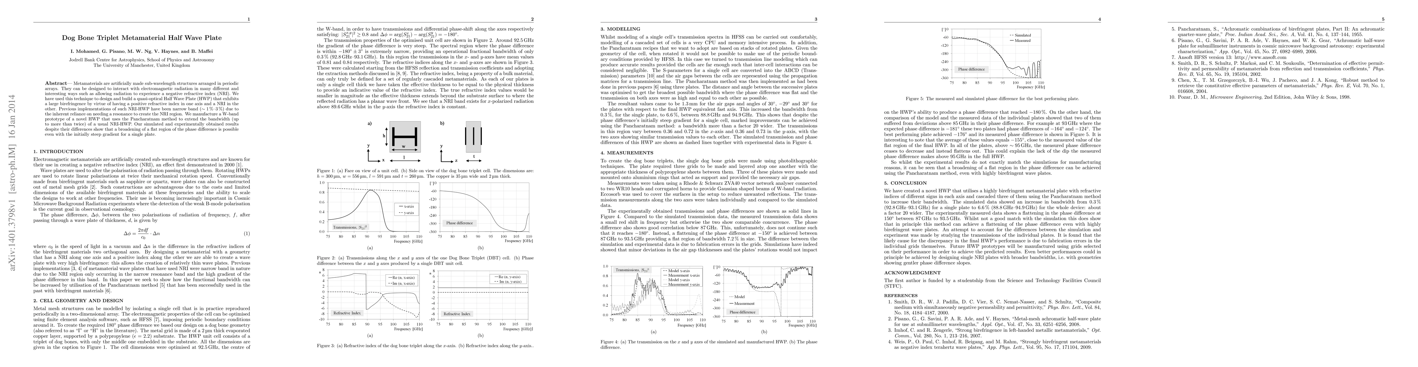 This paper presents a novel Dog Bone Triplet Metamaterial Wave Plate designed to achieve a wide bandwidth quasi-optical Half Wave Plate (HWP) utilizing Pancharatnam method, overcoming the narrow band limitations of traditional NRI-HWPs. Experimental and simulated results indicate successful broadening of the phase difference region, enhancing the device's operational range.