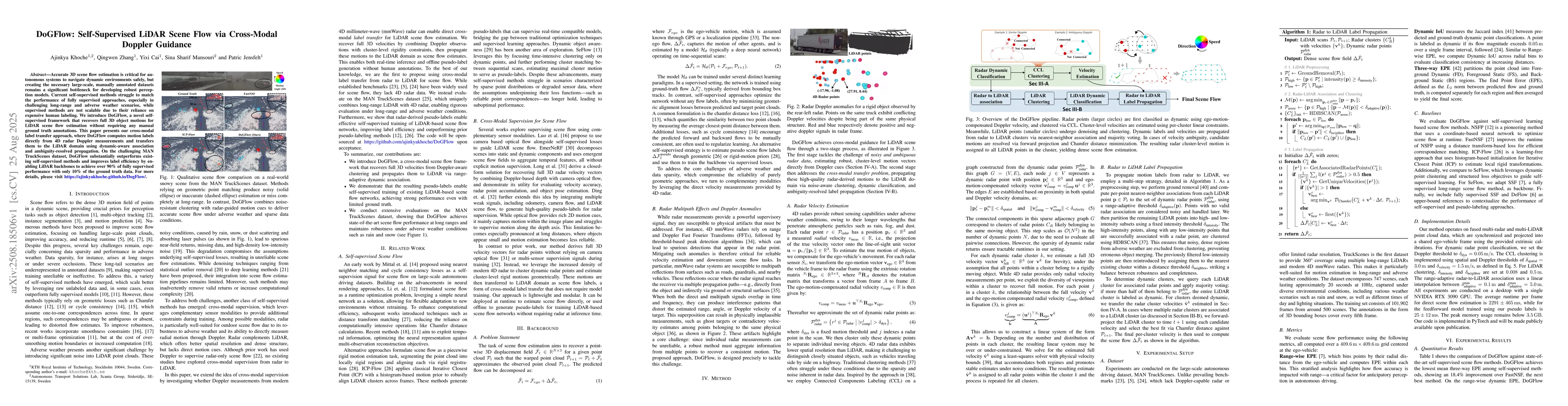 Accurate 3D scene flow estimation is critical for autonomous systems to navigate dynamic environments safely, but creating the necessary large-scale, manually annotated datasets remains a significant bottleneck for developing robust perception models. Current self-supervised methods struggle to match the performance of fully supervised approaches, especially in challenging long-range and adverse weather scenarios, while supervised methods are not scalable due to their reliance on expensive human labeling. We introduce DoGFlow, a novel self-supervised framework that recovers full 3D object motions for LiDAR scene flow estimation without requiring any manual ground truth annotations. This paper presents our cross-modal label transfer approach, where DoGFlow computes motion pseudo-labels in real-time directly from 4D radar Doppler measurements and transfers them to the LiDAR domain using dynamic-aware association and ambiguity-resolved propagation. On the challenging MAN TruckScenes dataset, DoGFlow substantially outperforms existing self-supervised methods and improves label efficiency by enabling LiDAR backbones to achieve over 90% of fully supervised performance with only 10% of the ground truth data. For more details, please visit https://ajinkyakhoche.github.io/DogFlow/