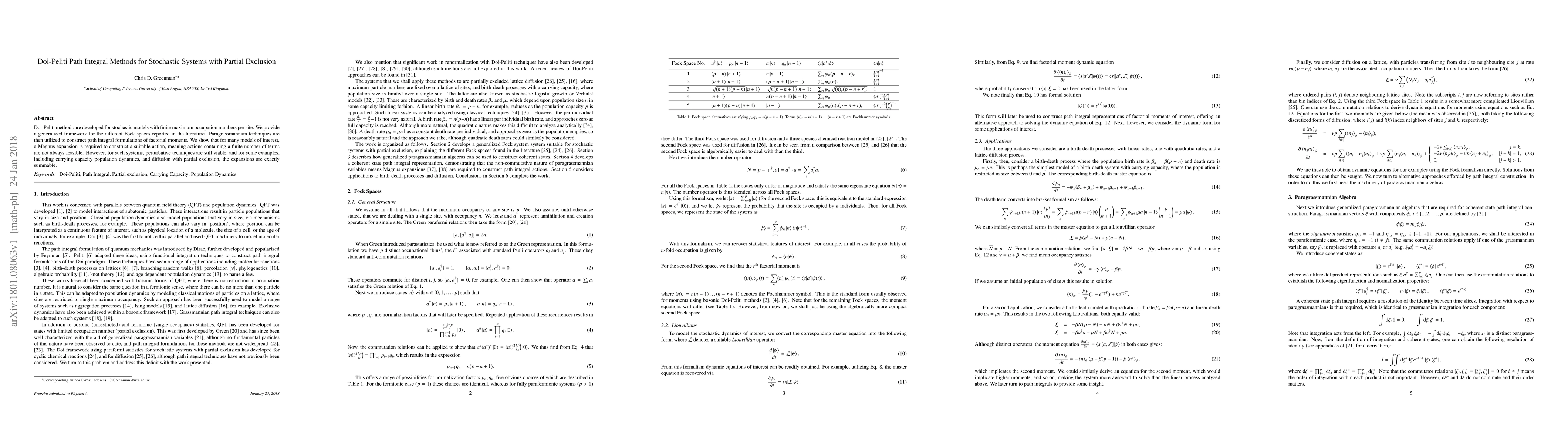 This research introduces a generalized Doi-Peliti framework for stochastic models with limited particle counts per site, using Paragrassmannian techniques to develop path integral formulations. While a finite Magnus expansion action may not always be feasible, perturbative methods remain applicable, with exact summability demonstrated for models like population dynamics with carrying capacity and diffusion with partial exclusion.