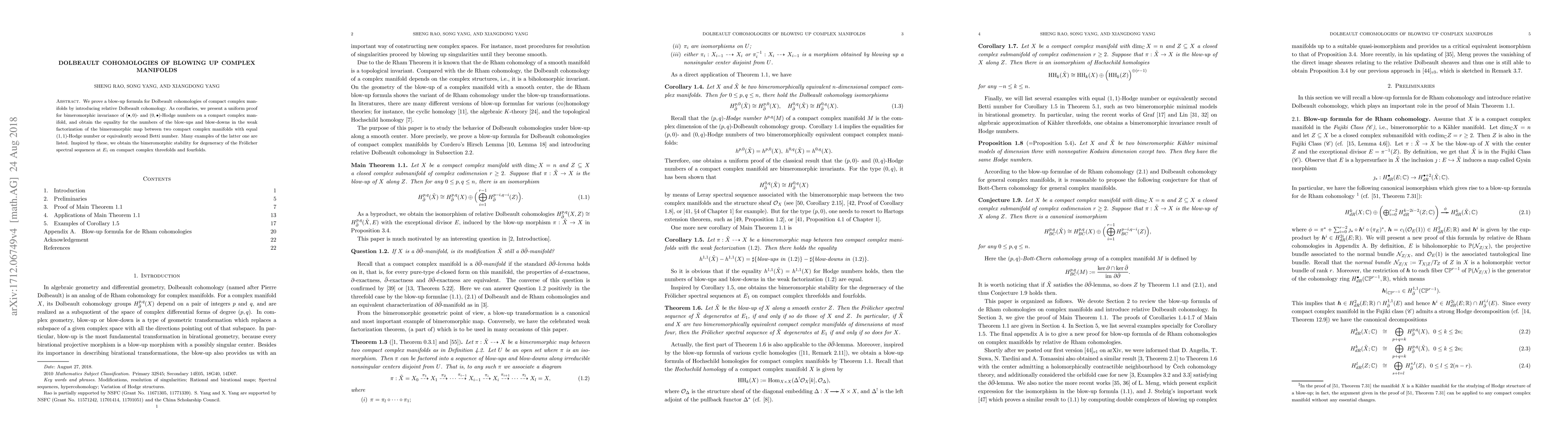 This paper establishes a blow-up formula for Dolbeault cohomologies of compact complex manifolds using relative Dolbeault cohomology, proving bimeromorphic invariance of Hodge numbers and the equality of blow-up and blow-down numbers in specific factorizations. It also demonstrates bimeromorphic stability for the Fr\"olicher spectral sequence degeneracy on complex threefolds and fourfolds.