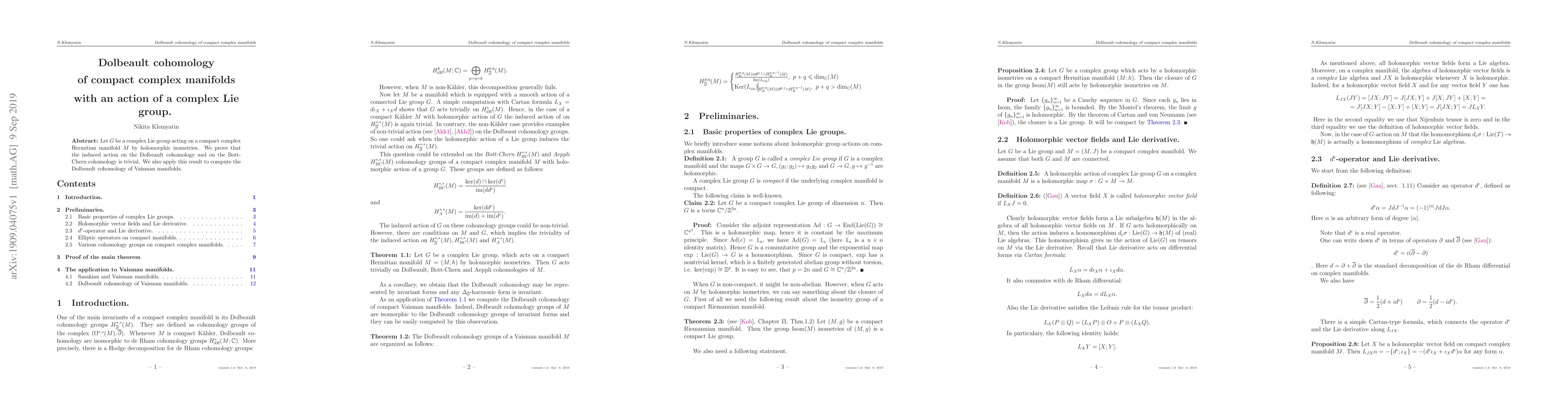 This paper proves that the action of a complex Lie group $G$ on a compact complex Hermitian manifold $M$ by holomorphic isometries trivially affects Dolbeault and Bott-Chern cohomologies. It also applies these findings to compute the Dolbeault cohomology of Vaisman manifolds.
