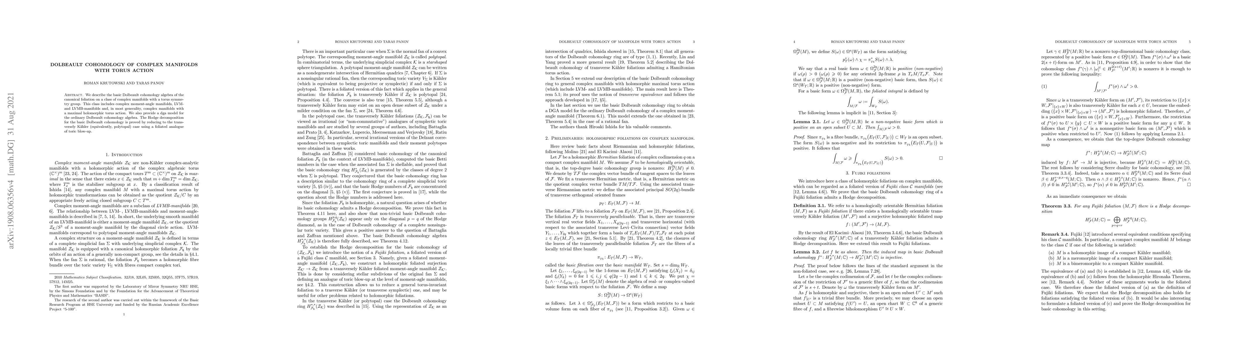 This paper examines the Dolbeault cohomology of complex manifolds with torus actions, particularly focusing on complex moment-angle, LVM, and LVMB-manifolds. It provides a dga model for the Dolbeault cohomology and proves the Hodge decomposition via a foliated toric blow-up technique.