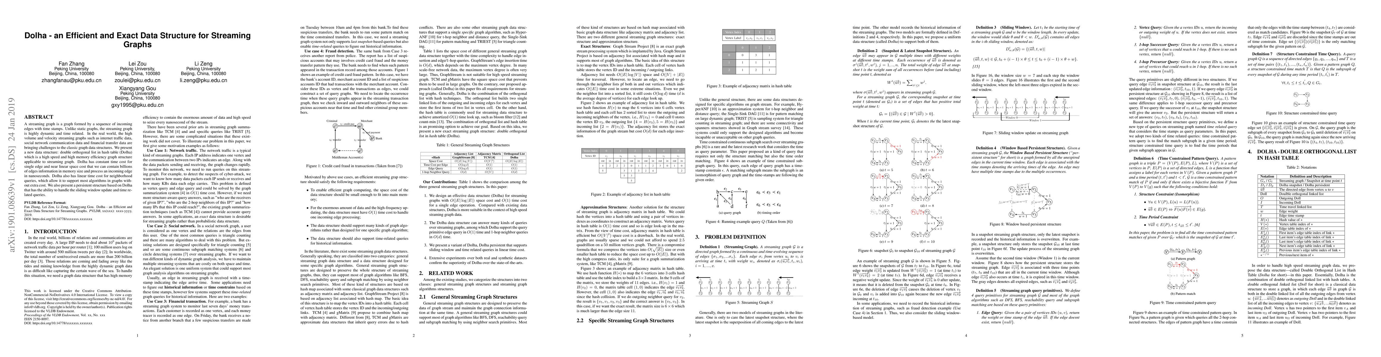 A streaming graph is a graph formed by a sequence of incoming edges with time stamps. Unlike static graphs, the streaming graph is highly dynamic and time related. In the real world, the high volume and velocity streaming graphs such as internet traffic data, social network communication data and financial transfer data are bringing challenges to the classic graph data structures. We present a new data structure: double orthogonal list in hash table (Dolha) which is a high speed and high memory efficiency graph structure applicable to streaming graph. Dolha has constant time cost for single edge and near linear space cost that we can contain billions of edges information in memory size and process an incoming edge in nanoseconds. Dolha also has linear time cost for neighborhood queries, which allow it to support most algorithms in graphs without extra cost. We also present a persistent structure based on Dolha that has the ability to handle the sliding window update and time related queries.