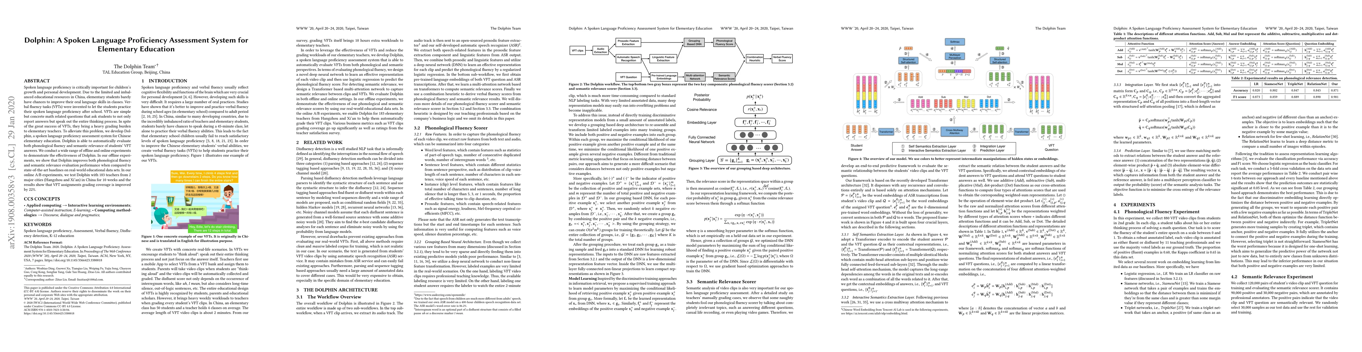 Dolphin is an automated spoken language proficiency assessment system designed to help elementary students in China improve their verbal fluency through Verbal Fluency Tasks (VFTs). The system effectively evaluates phonological fluency and semantic relevance, reducing the grading burden on teachers and improving VFT assignment coverage by 22% in online tests.