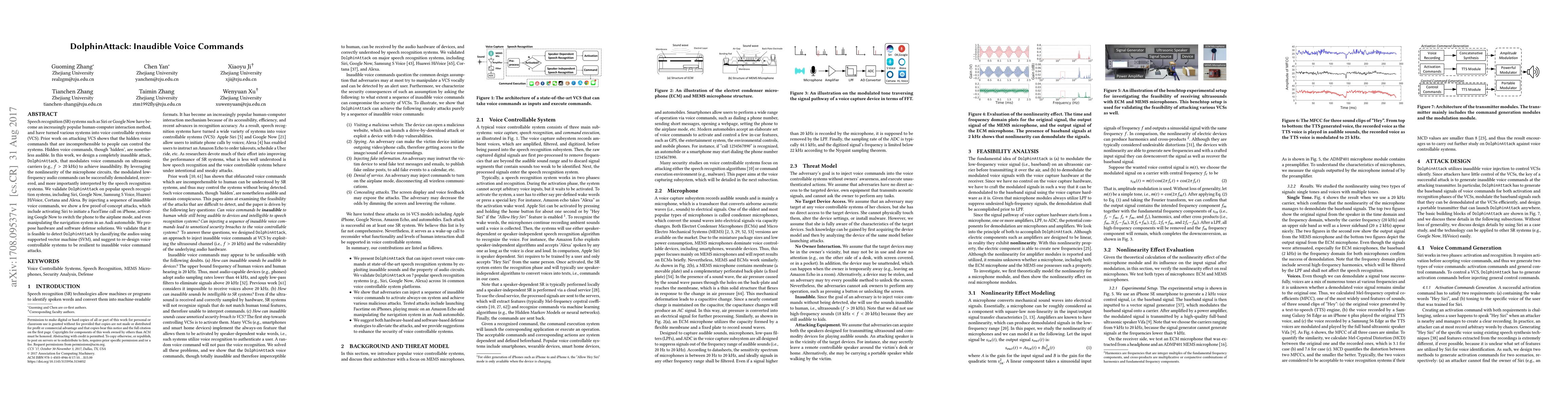 This paper introduces DolphinAttack, a novel method for launching attacks on voice-controlled systems using completely inaudible ultrasonic commands. The study demonstrates successful attacks on popular speech recognition systems, including Siri, Google Now, and others, and proposes hardware and software defenses to mitigate such threats.