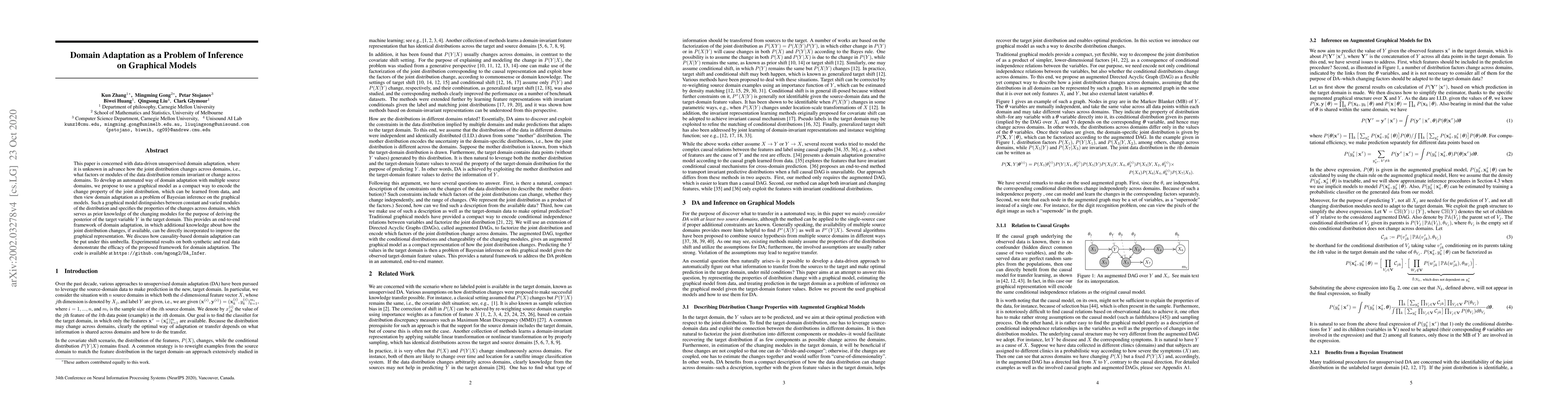 This paper proposes a graphical model approach for unsupervised domain adaptation, framing it as a Bayesian inference problem. The model encodes the invariant and changing factors of the joint distribution, providing a framework that can incorporate additional knowledge to improve adaptation, as demonstrated by experiments on synthetic and real datasets.
