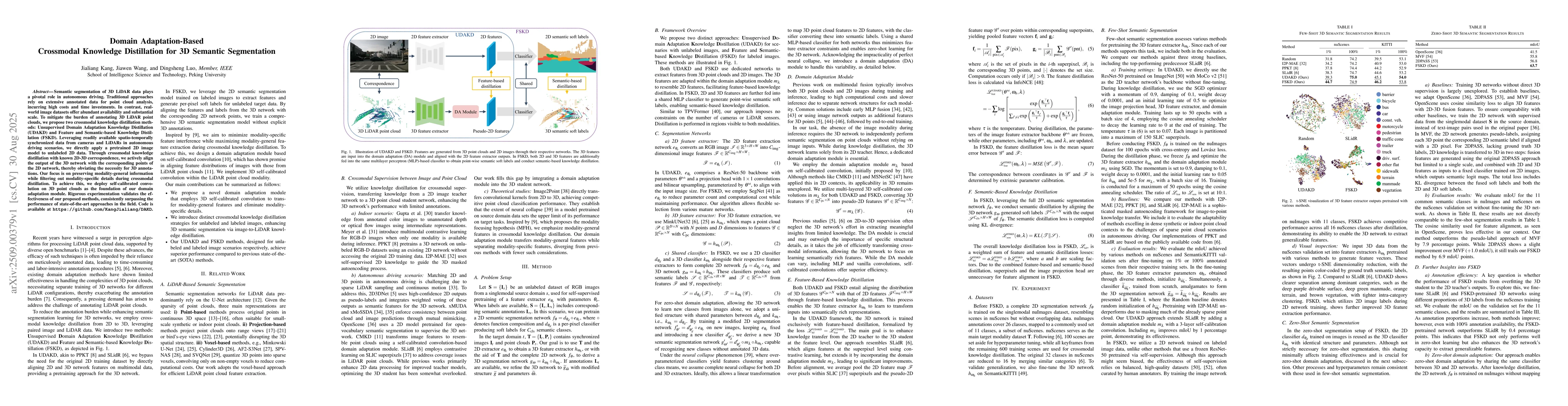 Semantic segmentation of 3D LiDAR data plays a pivotal role in autonomous driving. Traditional approaches rely on extensive annotated data for point cloud analysis, incurring high costs and time investments. In contrast, realworld image datasets offer abundant availability and substantial scale. To mitigate the burden of annotating 3D LiDAR point clouds, we propose two crossmodal knowledge distillation methods: Unsupervised Domain Adaptation Knowledge Distillation (UDAKD) and Feature and Semantic-based Knowledge Distillation (FSKD). Leveraging readily available spatio-temporally synchronized data from cameras and LiDARs in autonomous driving scenarios, we directly apply a pretrained 2D image model to unlabeled 2D data. Through crossmodal knowledge distillation with known 2D-3D correspondence, we actively align the output of the 3D network with the corresponding points of the 2D network, thereby obviating the necessity for 3D annotations. Our focus is on preserving modality-general information while filtering out modality-specific details during crossmodal distillation. To achieve this, we deploy self-calibrated convolution on 3D point clouds as the foundation of our domain adaptation module. Rigorous experimentation validates the effectiveness of our proposed methods, consistently surpassing the performance of state-of-the-art approaches in the field.