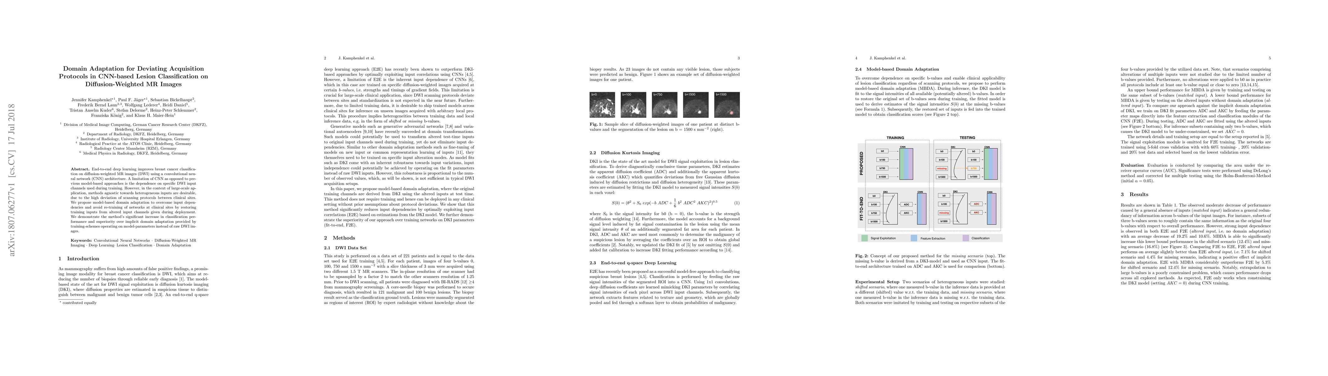 End-to-end deep learning improves breast cancer classification on diffusion-weighted MR images (DWI) using a convolutional neural network (CNN) architecture. A limitation of CNN as opposed to previous model-based approaches is the dependence on specific DWI input channels used during training. However, in the context of large-scale application, methods agnostic towards heterogeneous inputs are desirable, due to the high deviation of scanning protocols between clinical sites. We propose model-based domain adaptation to overcome input dependencies and avoid re-training of networks at clinical sites by restoring training inputs from altered input channels given during deployment. We demonstrate the method's significant increase in classification performance and superiority over implicit domain adaptation provided by training-schemes operating on model-parameters instead of raw DWI images.