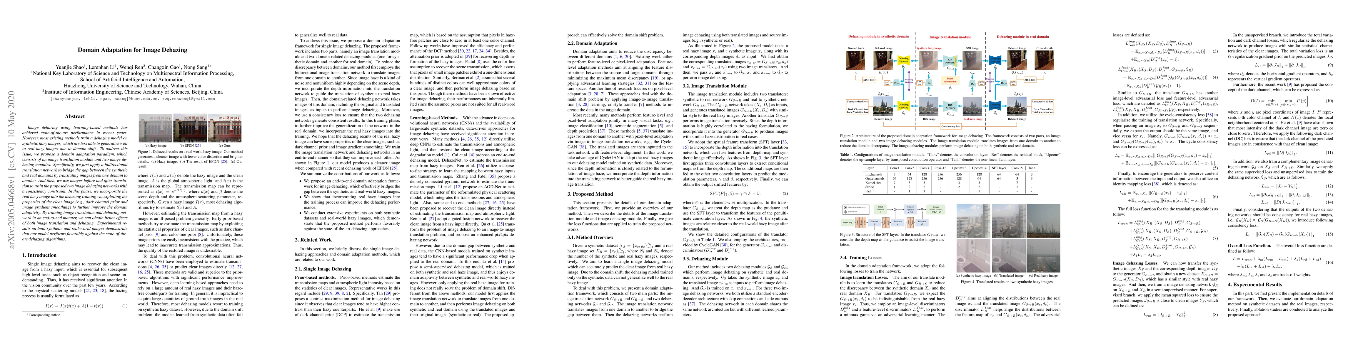 This paper proposes a domain adaptation method for image dehazing, combining an image translation network with two dehazing networks to bridge synthetic and real hazy images, achieving better generalization and outperforming existing state-of-the-art dehazing algorithms.
