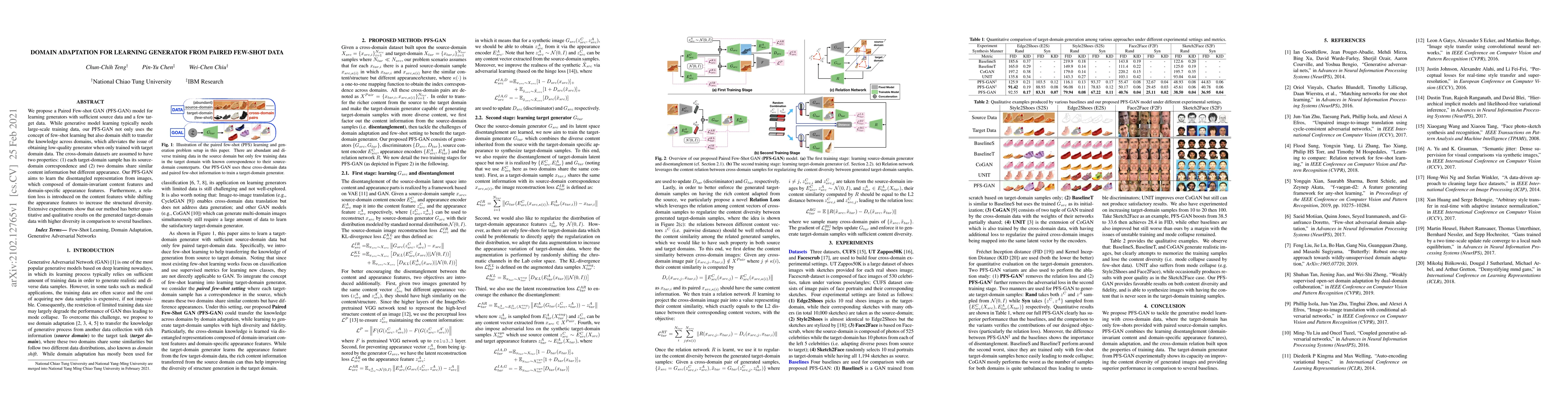 We propose a Paired Few-shot GAN (PFS-GAN) model for learning generators with sufficient source data and a few target data. While generative model learning typically needs large-scale training data, our PFS-GAN not only uses the concept of few-shot learning but also domain shift to transfer the knowledge across domains, which alleviates the issue of obtaining low-quality generator when only trained with target domain data. The cross-domain datasets are assumed to have two properties: (1) each target-domain sample has its source-domain correspondence and (2) two domains share similar content information but different appearance. Our PFS-GAN aims to learn the disentangled representation from images, which composed of domain-invariant content features and domain-specific appearance features. Furthermore, a relation loss is introduced on the content features while shifting the appearance features to increase the structural diversity. Extensive experiments show that our method has better quantitative and qualitative results on the generated target-domain data with higher diversity in comparison to several baselines.
