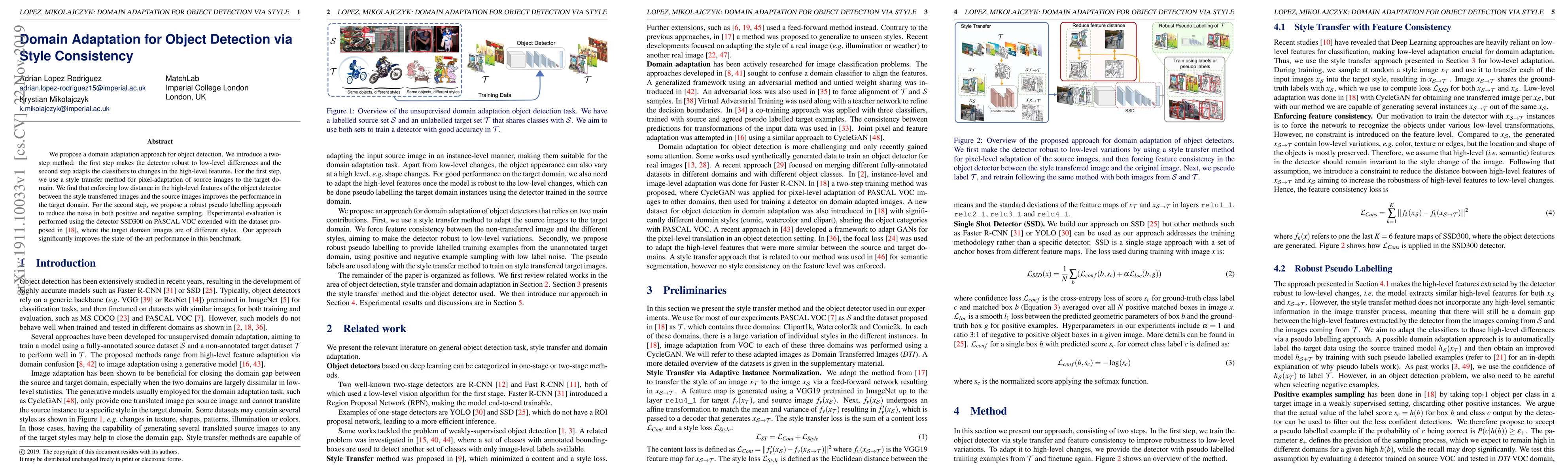 We propose a domain adaptation approach for object detection. We introduce a two-step method: the first step makes the detector robust to low-level differences and the second step adapts the classifiers to changes in the high-level features. For the first step, we use a style transfer method for pixel-adaptation of source images to the target domain. We find that enforcing low distance in the high-level features of the object detector between the style transferred images and the source images improves the performance in the target domain. For the second step, we propose a robust pseudo labelling approach to reduce the noise in both positive and negative sampling. Experimental evaluation is performed using the detector SSD300 on PASCAL VOC extended with the dataset proposed in arxiv:1803.11365 where the target domain images are of different styles. Our approach significantly improves the state-of-the-art performance in this benchmark.