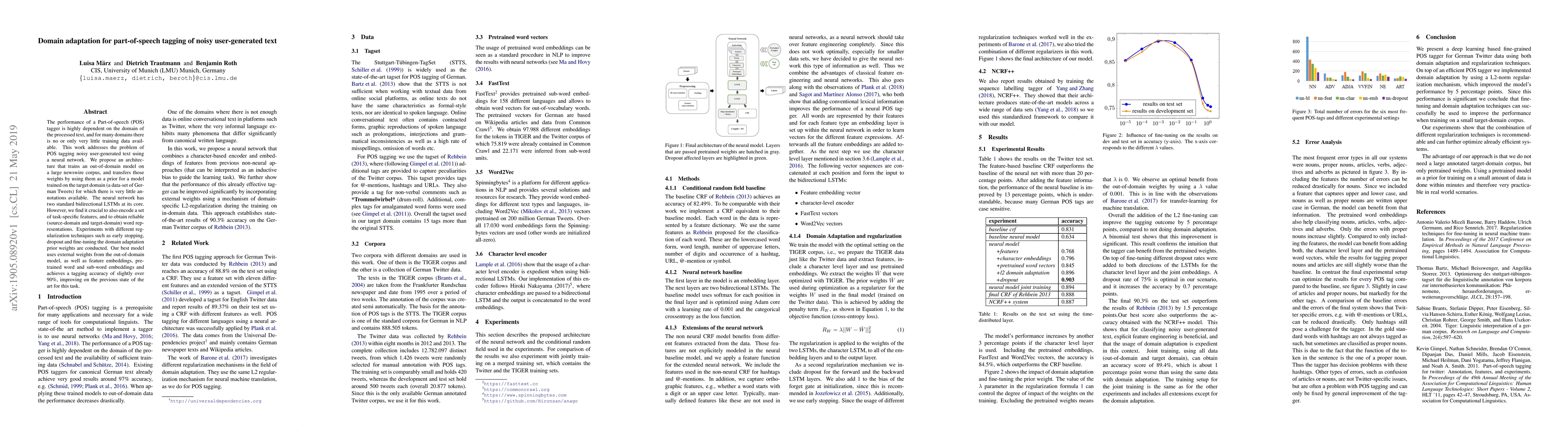 The performance of a Part-of-speech (POS) tagger is highly dependent on the domain ofthe processed text, and for many domains there is no or only very little training data available. This work addresses the problem of POS tagging noisy user-generated text using a neural network. We propose an architecture that trains an out-of-domain model on a large newswire corpus, and transfers those weights by using them as a prior for a model trained on the target domain (a data-set of German Tweets) for which there is very little an-notations available. The neural network has two standard bidirectional LSTMs at its core. However, we find it crucial to also encode a set of task-specific features, and to obtain reliable (source-domain and target-domain) word representations. Experiments with different regularization techniques such as early stopping, dropout and fine-tuning the domain adaptation prior weights are conducted. Our best model uses external weights from the out-of-domain model, as well as feature embeddings, pre-trained word and sub-word embeddings and achieves a tagging accuracy of slightly over 90%, improving on the previous state of the art for this task.