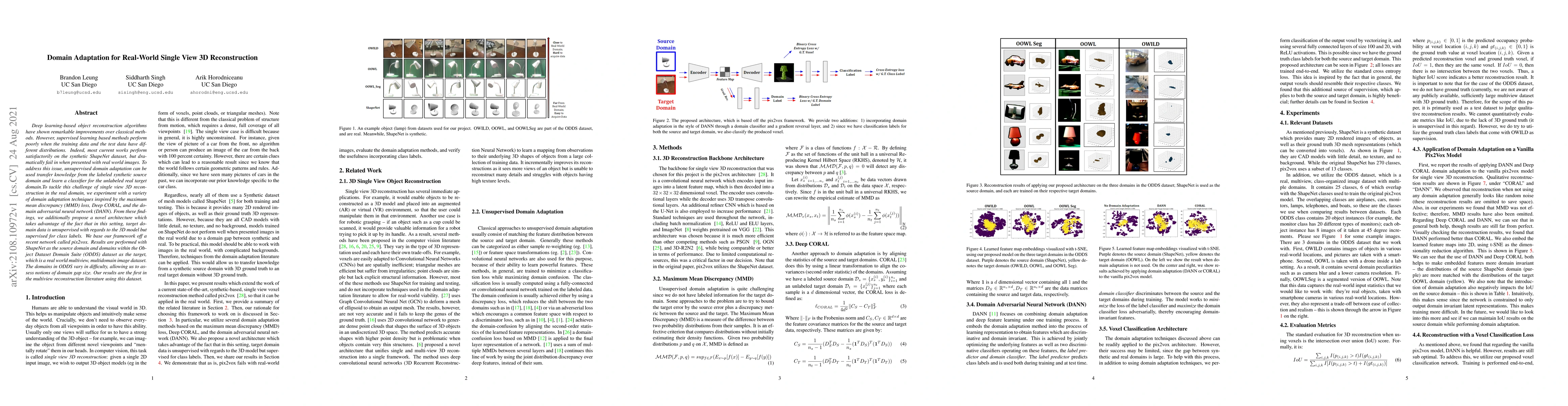 Deep learning-based object reconstruction algorithms have shown remarkable improvements over classical methods. However, supervised learning based methods perform poorly when the training data and the test data have different distributions. Indeed, most current works perform satisfactorily on the synthetic ShapeNet dataset, but dramatically fail in when presented with real world images. To address this issue, unsupervised domain adaptation can be used transfer knowledge from the labeled synthetic source domain and learn a classifier for the unlabeled real target domain. To tackle this challenge of single view 3D reconstruction in the real domain, we experiment with a variety of domain adaptation techniques inspired by the maximum mean discrepancy (MMD) loss, Deep CORAL, and the domain adversarial neural network (DANN). From these findings, we additionally propose a novel architecture which takes advantage of the fact that in this setting, target domain data is unsupervised with regards to the 3D model but supervised for class labels. We base our framework off a recent network called pix2vox. Results are performed with ShapeNet as the source domain and domains within the Object Dataset Domain Suite (ODDS) dataset as the target, which is a real world multiview, multidomain image dataset. The domains in ODDS vary in difficulty, allowing us to assess notions of domain gap size. Our results are the first in the multiview reconstruction literature using this dataset.