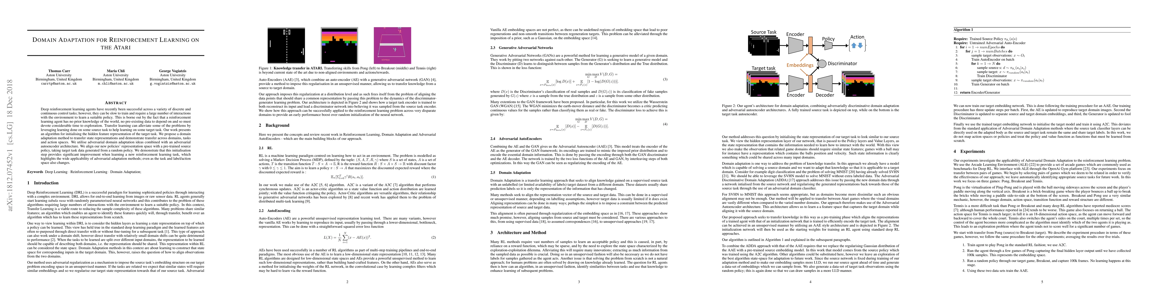 Deep reinforcement learning agents have recently been successful across a variety of discrete and continuous control tasks; however, they can be slow to train and require a large number of interactions with the environment to learn a suitable policy. This is borne out by the fact that a reinforcement learning agent has no prior knowledge of the world, no pre-existing data to depend on and so must devote considerable time to exploration. Transfer learning can alleviate some of the problems by leveraging learning done on some source task to help learning on some target task. Our work presents an algorithm for initialising the hidden feature representation of the target task. We propose a domain adaptation method to transfer state representations and demonstrate transfer across domains, tasks and action spaces. We utilise adversarial domain adaptation ideas combined with an adversarial autoencoder architecture. We align our new policies' representation space with a pre-trained source policy, taking target task data generated from a random policy. We demonstrate that this initialisation step provides significant improvement when learning a new reinforcement learning task, which highlights the wide applicability of adversarial adaptation methods; even as the task and label/action space also changes.