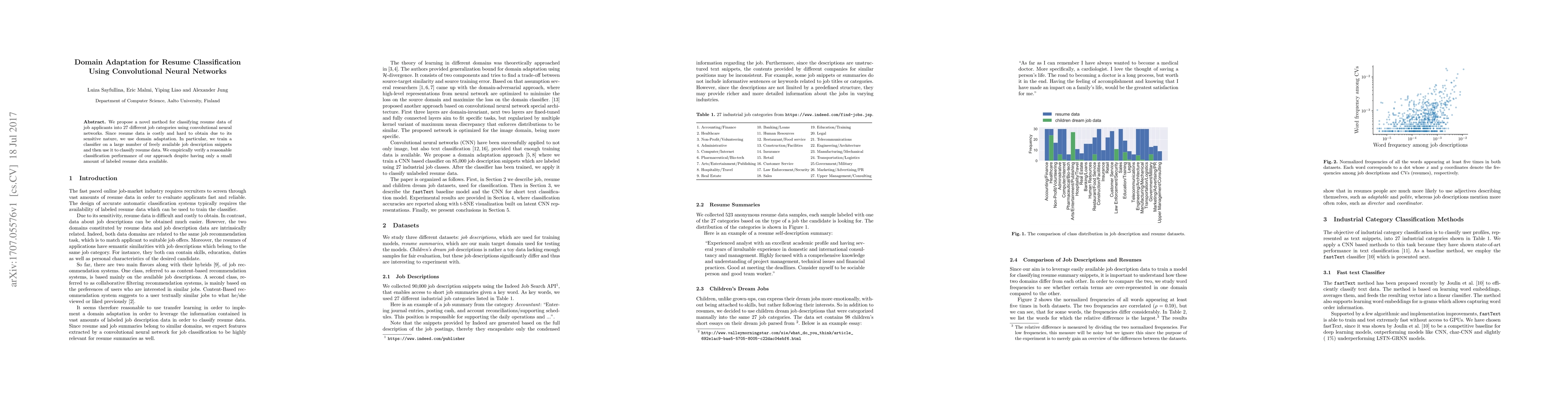 This paper introduces a method for classifying resumes into 27 job categories using convolutional neural networks, employing domain adaptation to leverage freely available job descriptions for training. Despite limited labeled resume data, the approach demonstrates reasonable classification performance.