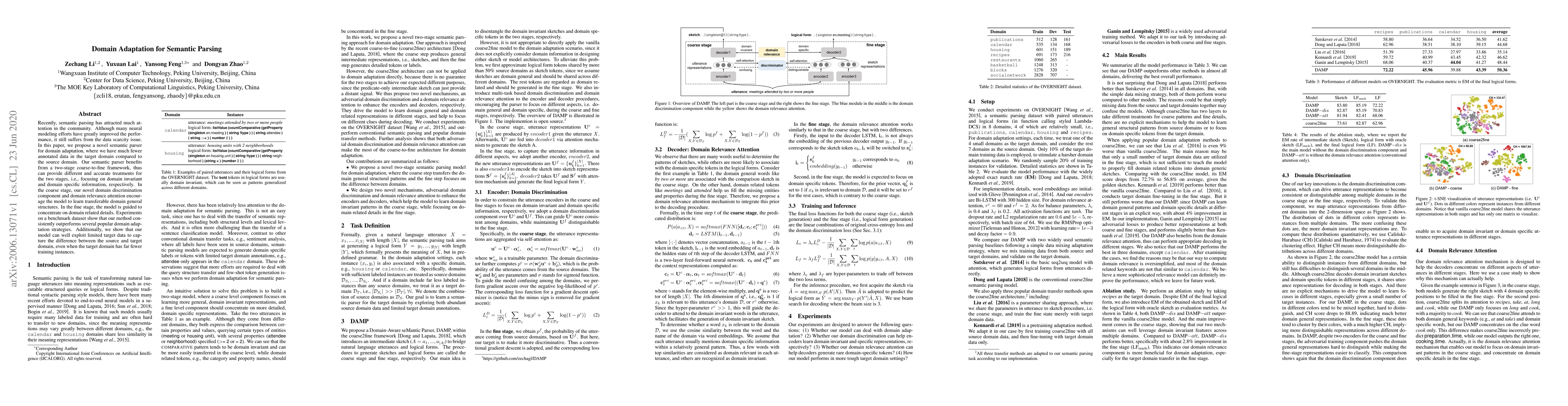 This paper proposes a novel semantic parser for domain adaptation that addresses data scarcity in target domains. It employs a two-stage coarse-to-fine framework, leveraging a domain discrimination component and attention mechanism to learn transferable general structures and domain-specific details, outperforming existing domain adaptation strategies in experiments.