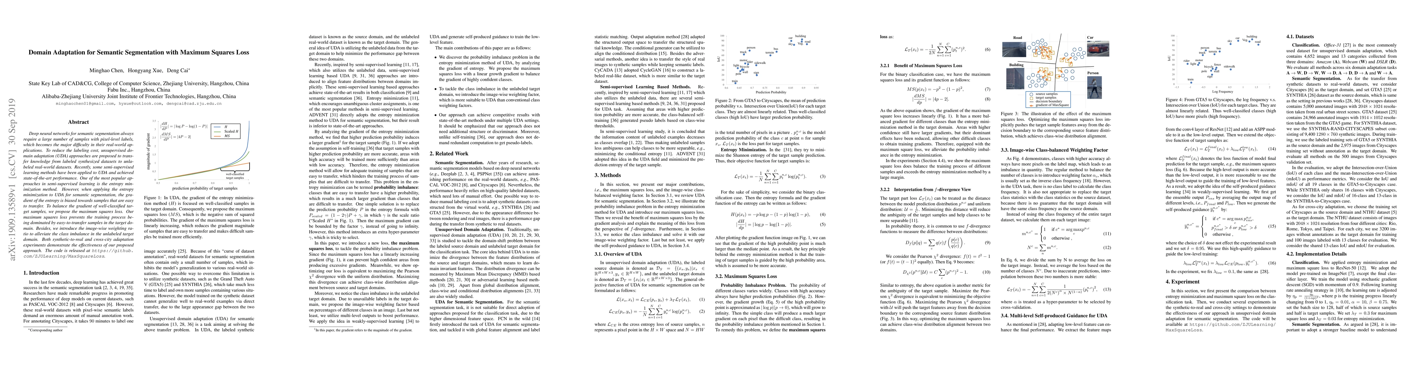 Deep neural networks for semantic segmentation always require a large number of samples with pixel-level labels, which becomes the major difficulty in their real-world applications. To reduce the labeling cost, unsupervised domain adaptation (UDA) approaches are proposed to transfer knowledge from labeled synthesized datasets to unlabeled real-world datasets. Recently, some semi-supervised learning methods have been applied to UDA and achieved state-of-the-art performance. One of the most popular approaches in semi-supervised learning is the entropy minimization method. However, when applying the entropy minimization to UDA for semantic segmentation, the gradient of the entropy is biased towards samples that are easy to transfer. To balance the gradient of well-classified target samples, we propose the maximum squares loss. Our maximum squares loss prevents the training process being dominated by easy-to-transfer samples in the target domain. Besides, we introduce the image-wise weighting ratio to alleviate the class imbalance in the unlabeled target domain. Both synthetic-to-real and cross-city adaptation experiments demonstrate the effectiveness of our proposed approach. The code is released at https://github. com/ZJULearning/MaxSquareLoss.