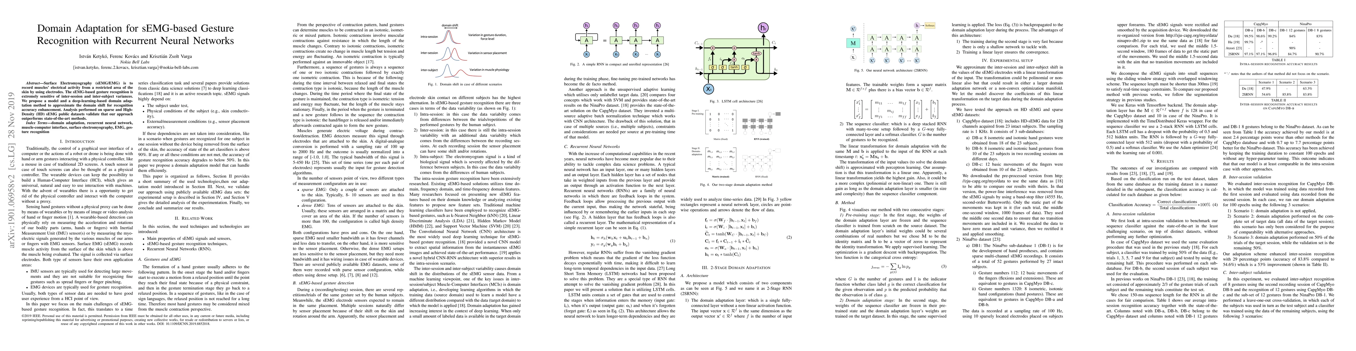 This paper proposes a deep-learning-based domain adaptation method for sEMG-based gesture recognition using Recurrent Neural Networks to address inter-session and inter-subject variances. Experimental results on public datasets demonstrate superior performance compared to state-of-the-art methods.