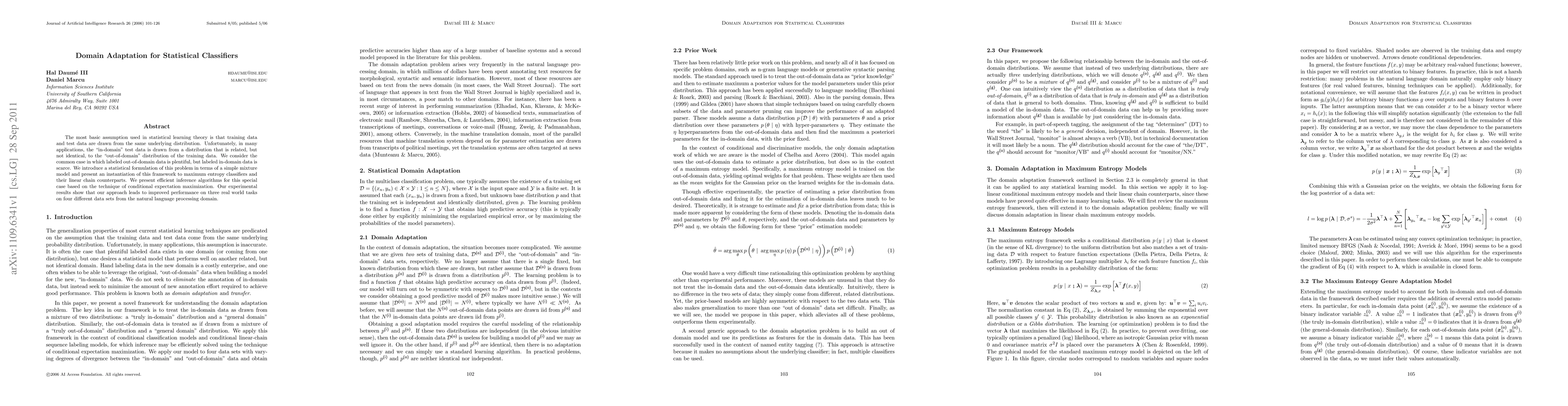 This paper addresses the domain adaptation challenge in statistical classifiers where training and test data distributions differ. It proposes a mixture model framework for maximum entropy classifiers, utilizing conditional expectation maximization for efficient inference, and demonstrates improved performance on NLP tasks across multiple datasets.
