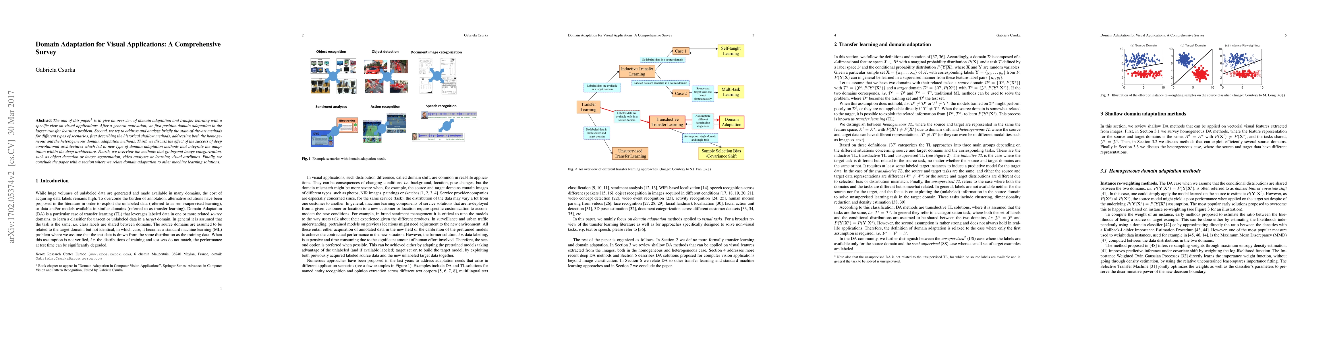 This paper offers a comprehensive survey on domain adaptation for visual applications, detailing its position within transfer learning, historical shallow methods, deep convolutional architecture-based techniques, and applications beyond image categorization like object detection or video analysis. It concludes by relating domain adaptation to other machine learning solutions.