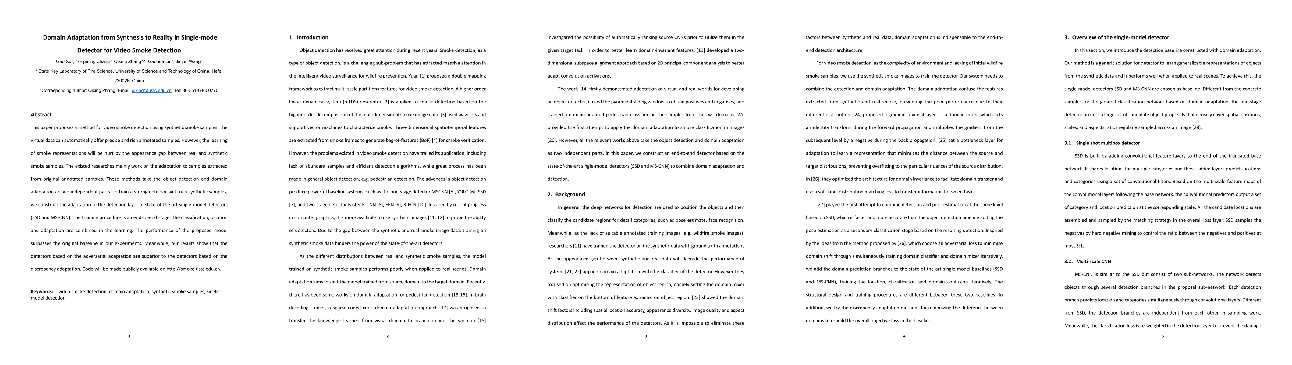 This paper introduces a method for video smoke detection using synthetic data, addressing the domain adaptation challenge between synthetic and real smoke samples. The proposed end-to-end training integrates classification, location, and domain adaptation, outperforming baseline models and demonstrating the effectiveness of adversarial adaptation over discrepancy adaptation.