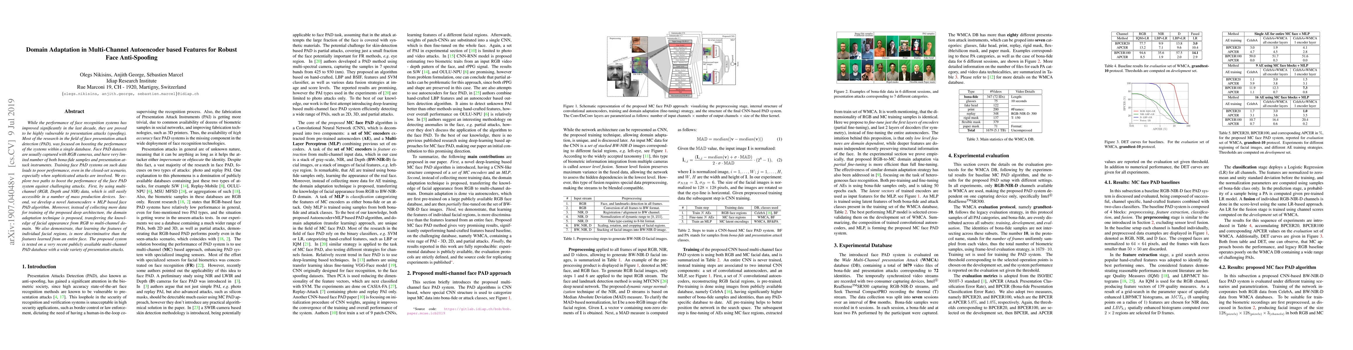 While the performance of face recognition systems has improved significantly in the last decade, they are proved to be highly vulnerable to presentation attacks (spoofing). Most of the research in the field of face presentation attack detection (PAD), was focused on boosting the performance of the systems within a single database. Face PAD datasets are usually captured with RGB cameras, and have very limited number of both bona-fide samples and presentation attack instruments. Training face PAD systems on such data leads to poor performance, even in the closed-set scenario, especially when sophisticated attacks are involved. We explore two paths to boost the performance of the face PAD system against challenging attacks. First, by using multi-channel (RGB, Depth and NIR) data, which is still easily accessible in a number of mass production devices. Second, we develop a novel Autoencoders + MLP based face PAD algorithm. Moreover, instead of collecting more data for training of the proposed deep architecture, the domain adaptation technique is proposed, transferring the knowledge of facial appearance from RGB to multi-channel domain. We also demonstrate, that learning the features of individual facial regions, is more discriminative than the features learned from an entire face. The proposed system is tested on a very recent publicly available multi-channel PAD database with a wide variety of presentation attacks.