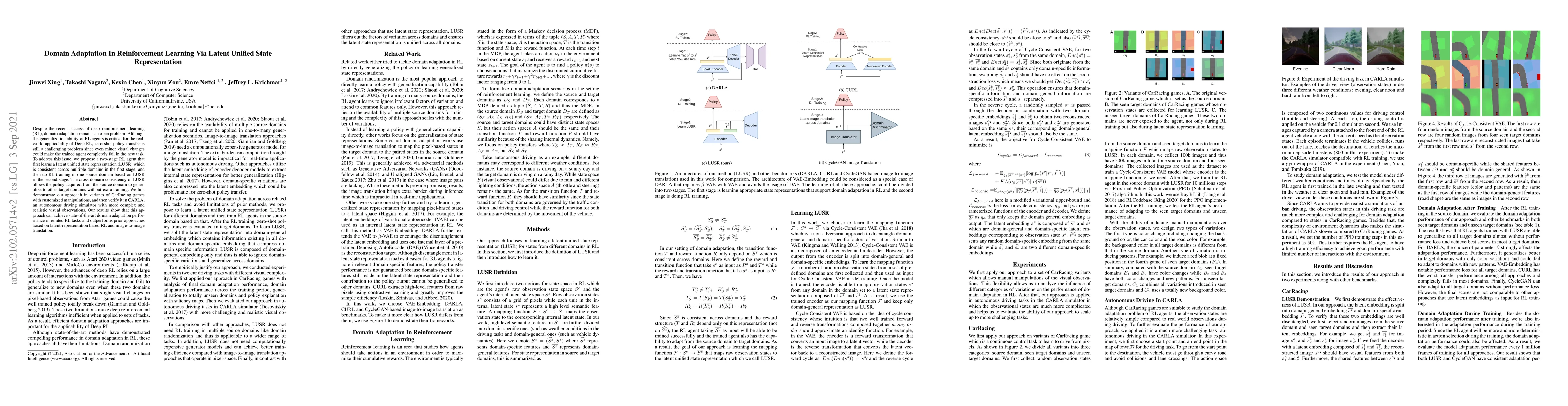 This paper proposes a two-stage reinforcement learning (RL) agent that learns a latent unified state representation (LUSR) to enable domain adaptation across different environments. The LUSR facilitates zero-shot policy transfer from a source domain to target domains, achieving state-of-the-art performance in domain adaptation tasks.