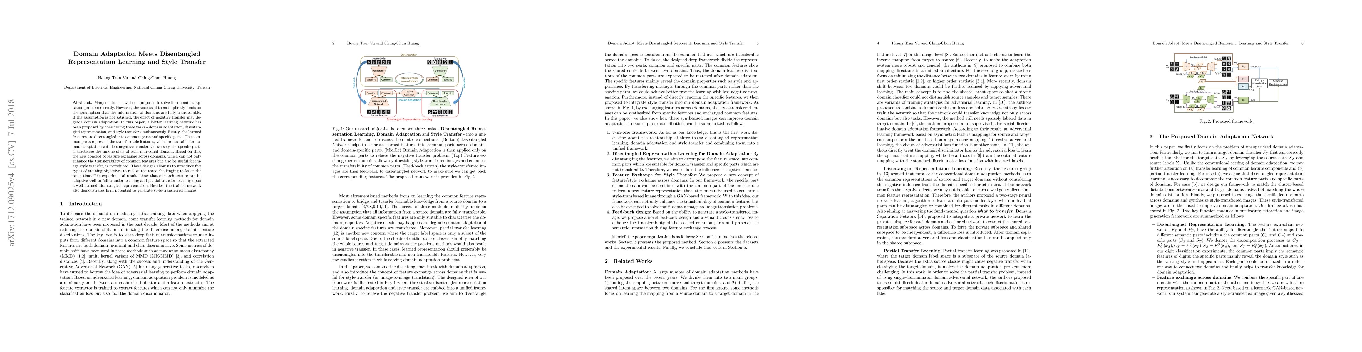 This paper proposes a network that simultaneously addresses domain adaptation, disentangled representation learning, and style transfer by disentangling features into common and specific parts. The architecture introduces five training objectives to achieve these tasks, demonstrating adaptability to both full and partial transfer learning while also showing potential for generating style-transferred images.