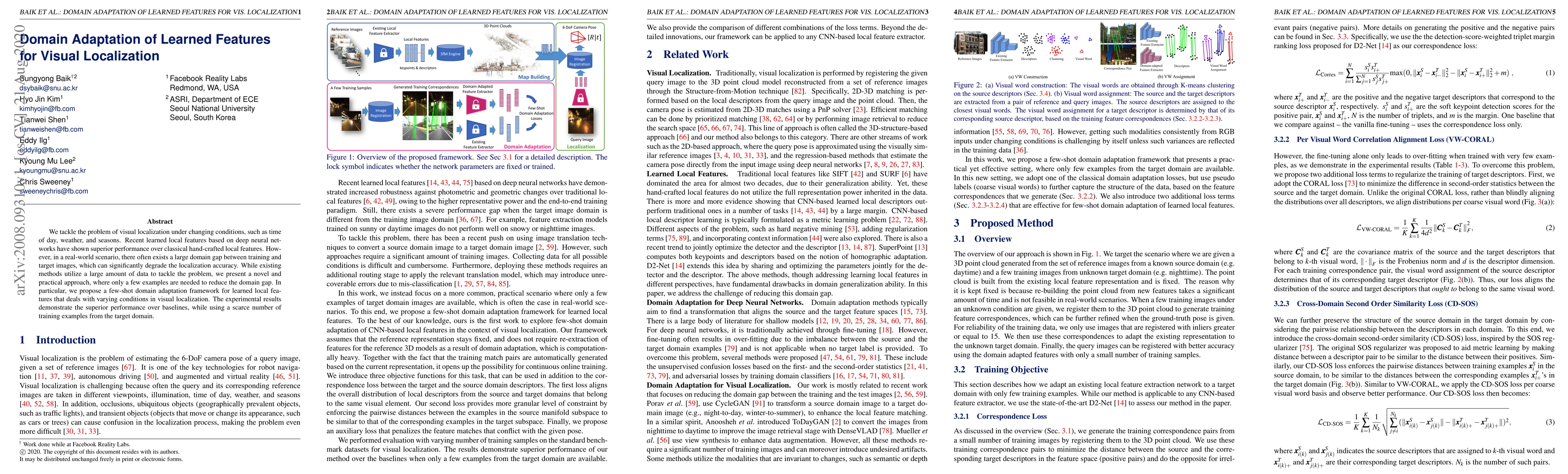 We tackle the problem of visual localization under changing conditions, such as time of day, weather, and seasons. Recent learned local features based on deep neural networks have shown superior performance over classical hand-crafted local features. However, in a real-world scenario, there often exists a large domain gap between training and target images, which can significantly degrade the localization accuracy. While existing methods utilize a large amount of data to tackle the problem, we present a novel and practical approach, where only a few examples are needed to reduce the domain gap. In particular, we propose a few-shot domain adaptation framework for learned local features that deals with varying conditions in visual localization. The experimental results demonstrate the superior performance over baselines, while using a scarce number of training examples from the target domain.