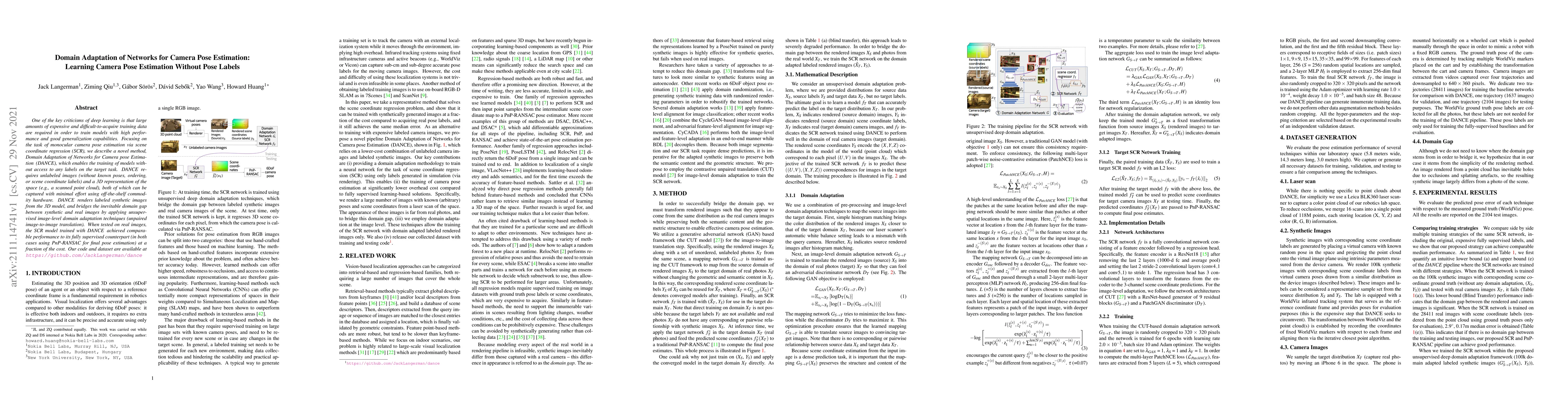 One of the key criticisms of deep learning is that large amounts of expensive and difficult-to-acquire training data are required in order to train models with high performance and good generalization capabilities. Focusing on the task of monocular camera pose estimation via scene coordinate regression (SCR), we describe a novel method, Domain Adaptation of Networks for Camera pose Estimation (DANCE), which enables the training of models without access to any labels on the target task. DANCE requires unlabeled images (without known poses, ordering, or scene coordinate labels) and a 3D representation of the space (e.g., a scanned point cloud), both of which can be captured with minimal effort using off-the-shelf commodity hardware. DANCE renders labeled synthetic images from the 3D model, and bridges the inevitable domain gap between synthetic and real images by applying unsupervised image-level domain adaptation techniques (unpaired image-to-image translation). When tested on real images, the SCR model trained with DANCE achieved comparable performance to its fully supervised counterpart (in both cases using PnP-RANSAC for final pose estimation) at a fraction of the cost. Our code and dataset are available at https://github.com/JackLangerman/dance