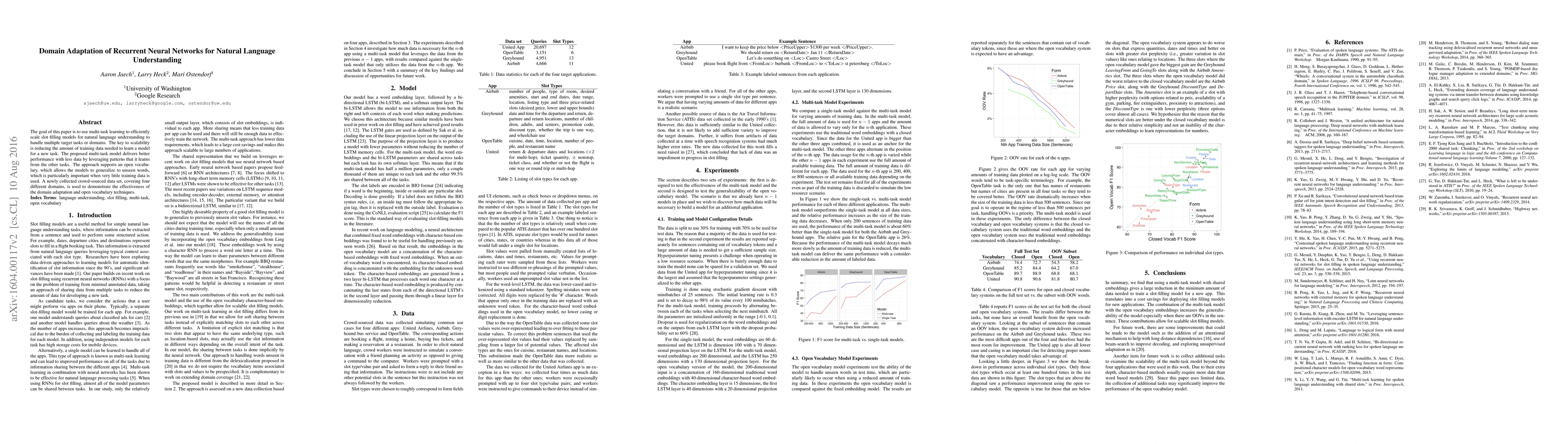 The goal of this paper is to use multi-task learning to efficiently scale slot filling models for natural language understanding to handle multiple target tasks or domains. The key to scalability is reducing the amount of training data needed to learn a model for a new task. The proposed multi-task model delivers better performance with less data by leveraging patterns that it learns from the other tasks. The approach supports an open vocabulary, which allows the models to generalize to unseen words, which is particularly important when very little training data is used. A newly collected crowd-sourced data set, covering four different domains, is used to demonstrate the effectiveness of the domain adaptation and open vocabulary techniques.