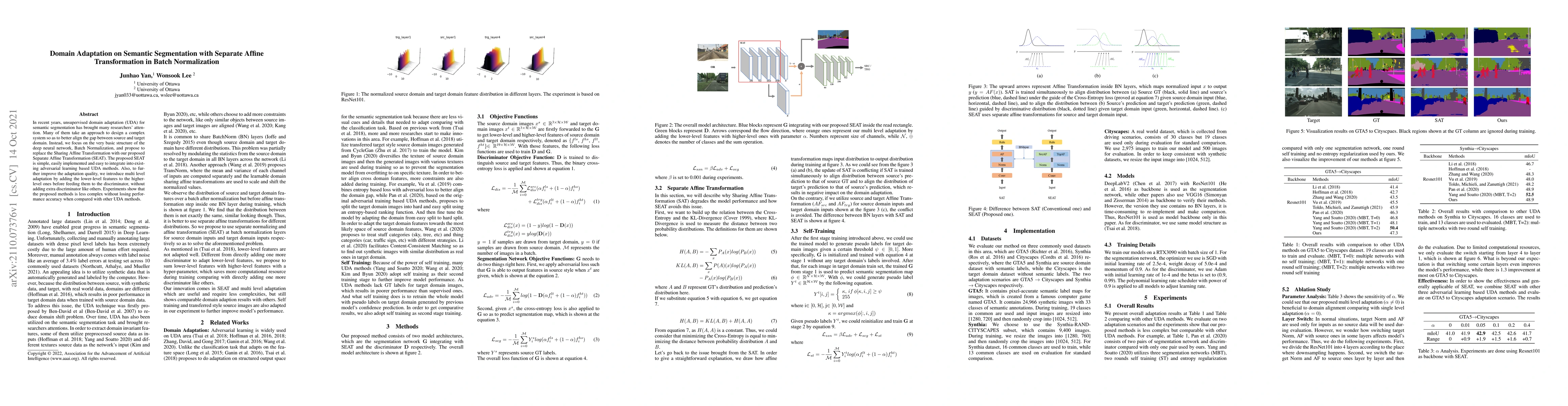 In recent years, unsupervised domain adaptation (UDA) for semantic segmentation has brought many researchers'attention. Many of them take an approach to design a complex system so as to better align the gap between source and target domain. Instead, we focus on the very basic structure of the deep neural network, Batch Normalization, and propose to replace the Sharing Affine Transformation with our proposed Separate Affine Transformation (SEAT). The proposed SEAT is simple, easily implemented and easy to integrate into existing adversarial learning based UDA methods. Also, to further improve the adaptation quality, we introduce multi level adaptation by adding the lower-level features to the higher-level ones before feeding them to the discriminator, without adding extra discriminator like others. Experiments show that the proposed methods is less complex without losing performance accuracy when compared with other UDA methods.
