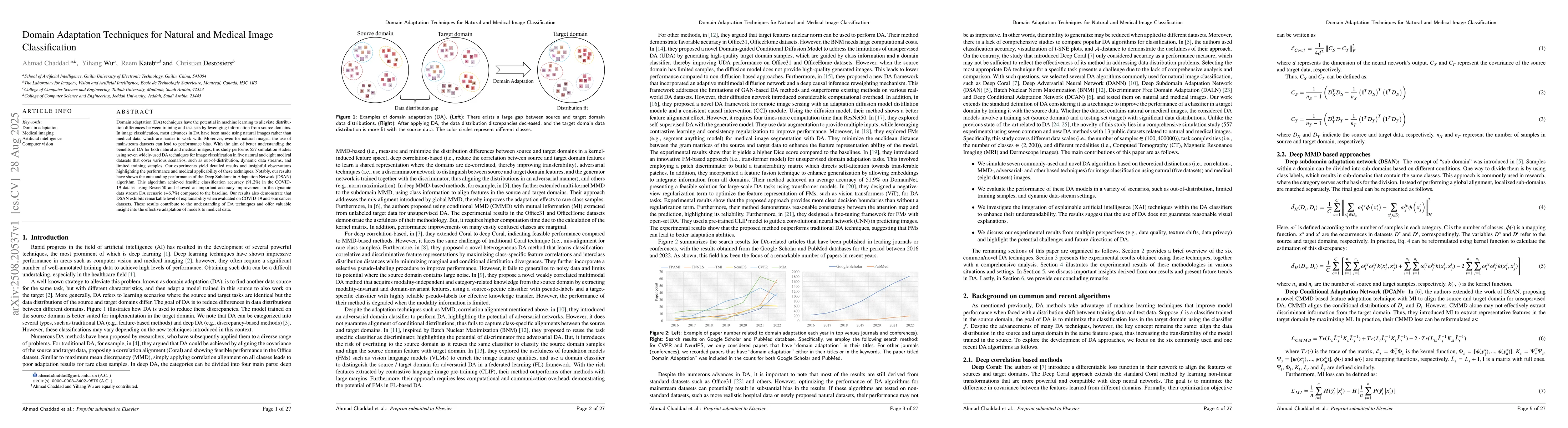 Domain adaptation (DA) techniques have the potential in machine learning to alleviate distribution differences between training and test sets by leveraging information from source domains. In image classification, most advances in DA have been made using natural images rather than medical data, which are harder to work with. Moreover, even for natural images, the use of mainstream datasets can lead to performance bias. {With the aim of better understanding the benefits of DA for both natural and medical images, this study performs 557 simulation studies using seven widely-used DA techniques for image classification in five natural and eight medical datasets that cover various scenarios, such as out-of-distribution, dynamic data streams, and limited training samples.} Our experiments yield detailed results and insightful observations highlighting the performance and medical applicability of these techniques. Notably, our results have shown the outstanding performance of the Deep Subdomain Adaptation Network (DSAN) algorithm. This algorithm achieved feasible classification accuracy (91.2\%) in the COVID-19 dataset using Resnet50 and showed an important accuracy improvement in the dynamic data stream DA scenario (+6.7\%) compared to the baseline. Our results also demonstrate that DSAN exhibits remarkable level of explainability when evaluated on COVID-19 and skin cancer datasets. These results contribute to the understanding of DA techniques and offer valuable insight into the effective adaptation of models to medical data.