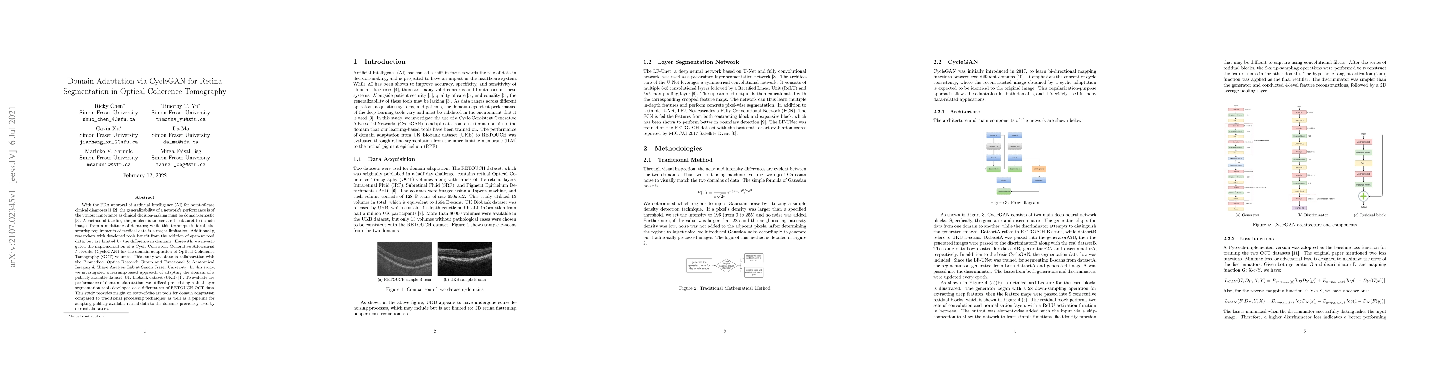 With the FDA approval of Artificial Intelligence (AI) for point-of-care clinical diagnoses, model generalizability is of the utmost importance as clinical decision-making must be domain-agnostic. A method of tackling the problem is to increase the dataset to include images from a multitude of domains; while this technique is ideal, the security requirements of medical data is a major limitation. Additionally, researchers with developed tools benefit from the addition of open-sourced data, but are limited by the difference in domains. Herewith, we investigated the implementation of a Cycle-Consistent Generative Adversarial Networks (CycleGAN) for the domain adaptation of Optical Coherence Tomography (OCT) volumes. This study was done in collaboration with the Biomedical Optics Research Group and Functional & Anatomical Imaging & Shape Analysis Lab at Simon Fraser University. In this study, we investigated a learning-based approach of adapting the domain of a publicly available dataset, UK Biobank dataset (UKB). To evaluate the performance of domain adaptation, we utilized pre-existing retinal layer segmentation tools developed on a different set of RETOUCH OCT data. This study provides insight on state-of-the-art tools for domain adaptation compared to traditional processing techniques as well as a pipeline for adapting publicly available retinal data to the domains previously used by our collaborators.