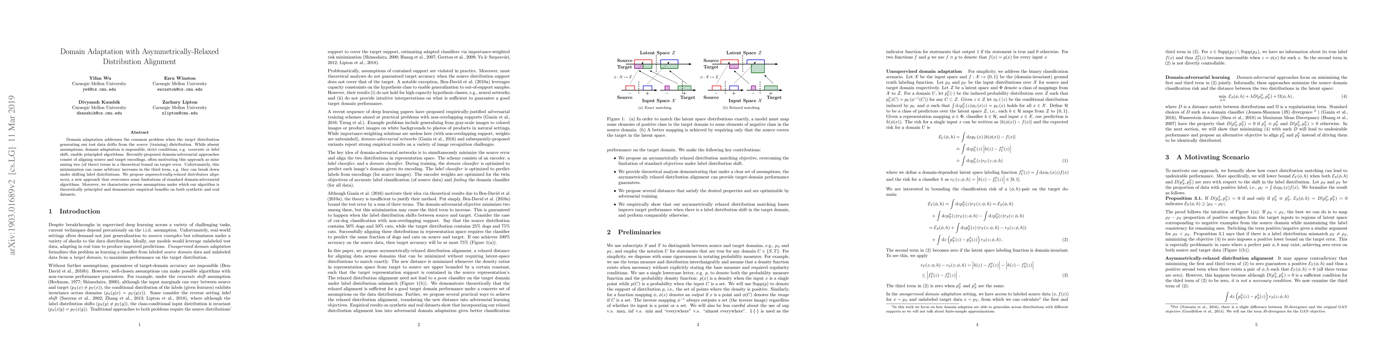 This paper proposes a new domain adaptation method called asymmetrically-relaxed distribution alignment to overcome limitations of existing domain-adversarial approaches, particularly under shifting label distributions. The method is theoretically grounded and empirically shown to perform better on synthetic and real datasets.