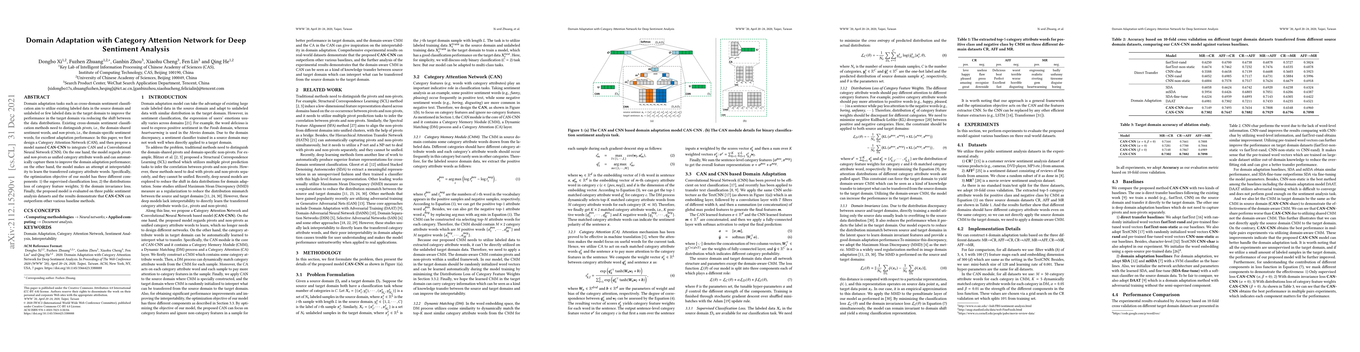 This research introduces a Category Attention Network (CAN) integrated with a Convolutional Neural Network (CNN) to enhance domain adaptation for cross-domain sentiment classification. The proposed CAN-CNN model aims to automatically distinguish and utilize domain-shared and domain-specific sentiment words, achieving better adaptation performance. The model's optimization includes supervised classification, category feature weight distribution, and domain invariance losses, demonstrating superior results over baseline methods on public sentiment datasets.