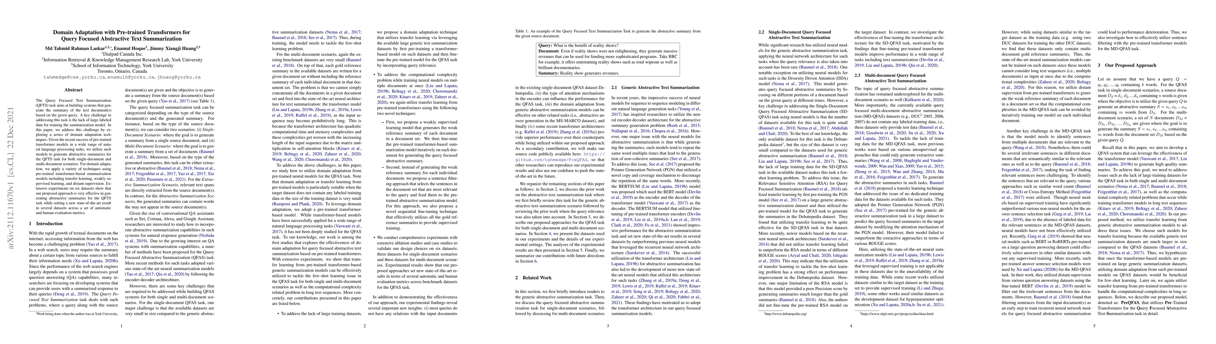 This paper proposes domain adaptation techniques leveraging pre-trained transformer models for Query Focused Text Summarization (QFTS), addressing the challenge of limited labeled data. The approach utilizes transfer learning, weakly supervised learning, and distant supervision, achieving state-of-the-art results in generating abstractive summaries across multiple datasets.