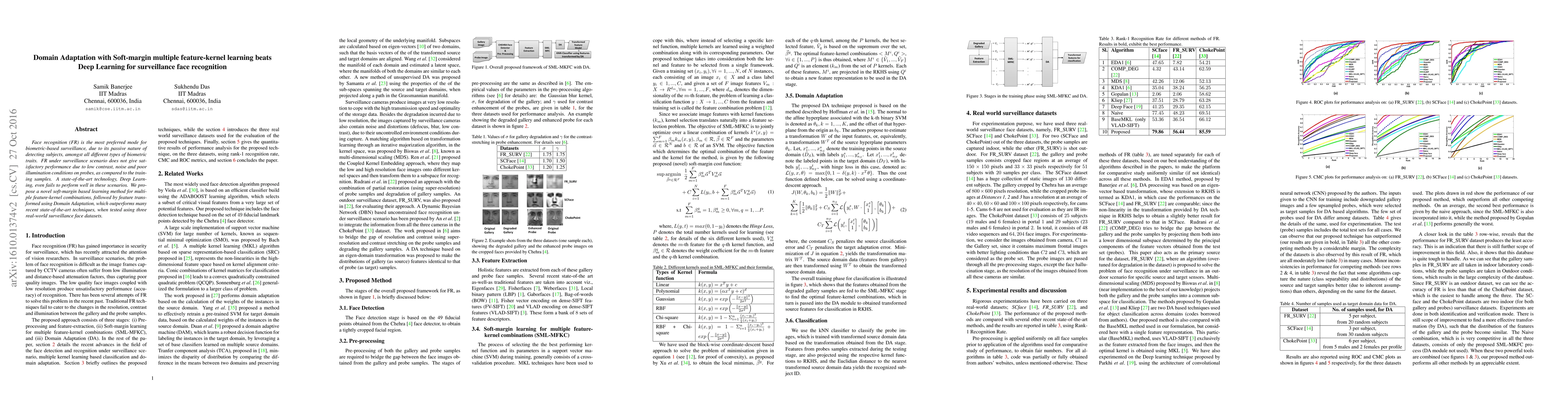 Face recognition (FR) is the most preferred mode for biometric-based surveillance, due to its passive nature of detecting subjects, amongst all different types of biometric traits. FR under surveillance scenario does not give satisfactory performance due to low contrast, noise and poor illumination conditions on probes, as compared to the training samples. A state-of-the-art technology, Deep Learning, even fails to perform well in these scenarios. We propose a novel soft-margin based learning method for multiple feature-kernel combinations, followed by feature transformed using Domain Adaptation, which outperforms many recent state-of-the-art techniques, when tested using three real-world surveillance face datasets.