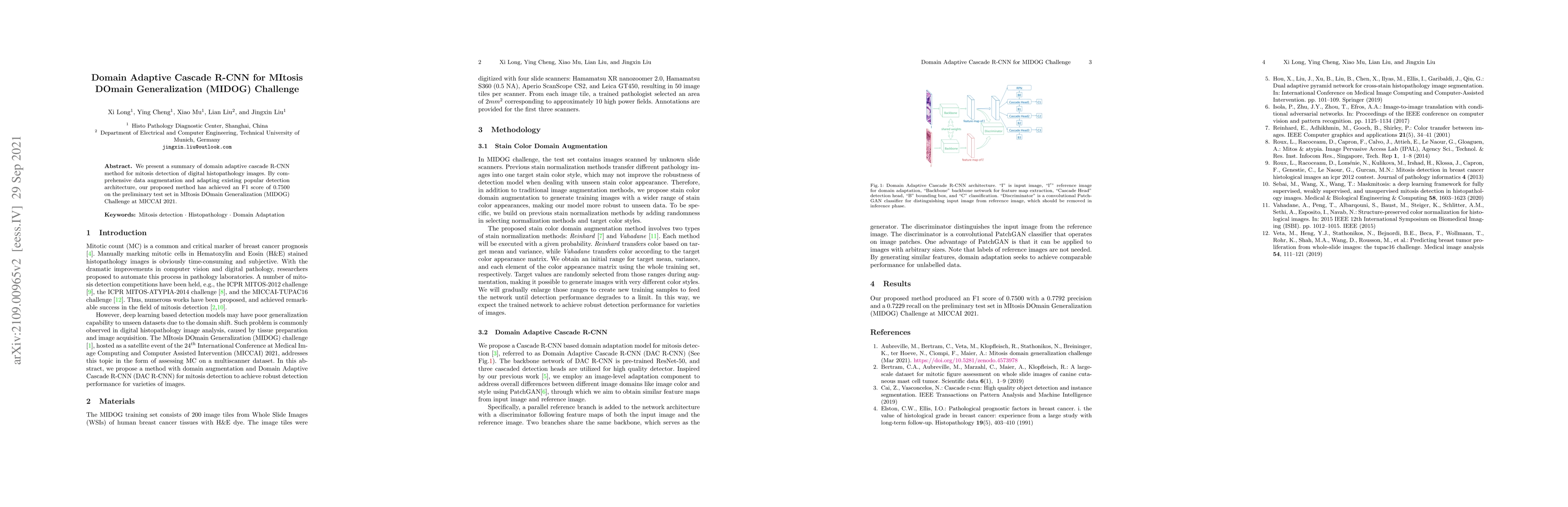 The paper proposes a domain adaptive cascade R-CNN for mitosis detection in digital histopathology images, achieving an F1 score of 0.7500 in the MIDOG Challenge at MICCAI 2021, leveraging data augmentation and an adapted detection architecture.