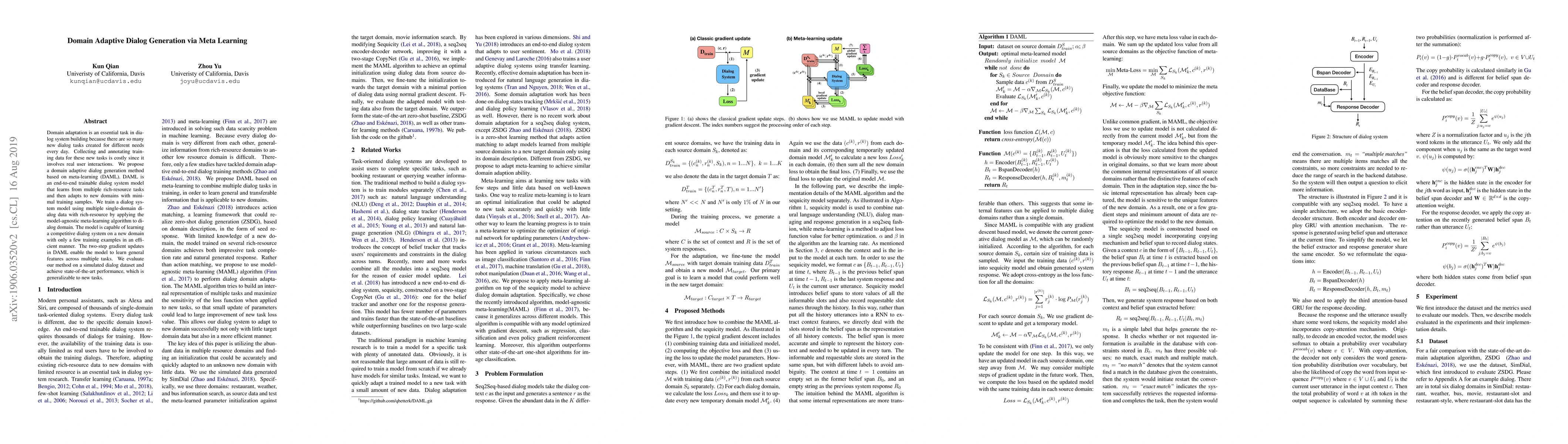 The paper introduces DAML, a domain adaptive dialog generation method based on meta-learning, designed to efficiently adapt to new dialog tasks with minimal training data. The proposed model achieves state-of-the-art performance on simulated datasets, demonstrating its generalizability to new tasks.