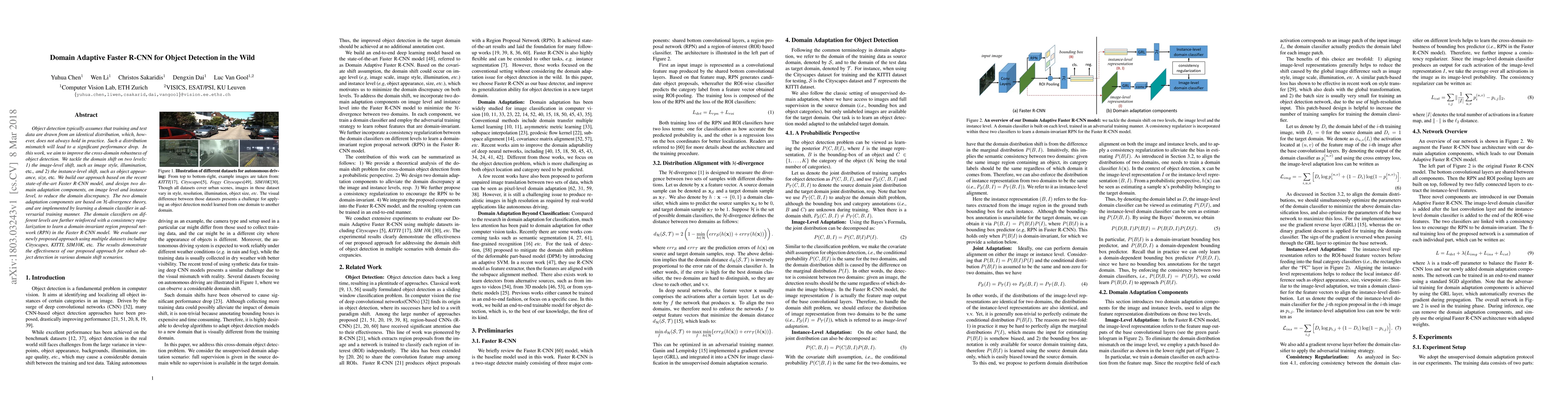 Object detection typically assumes that training and test data are drawn from an identical distribution, which, however, does not always hold in practice. Such a distribution mismatch will lead to a significant performance drop. In this work, we aim to improve the cross-domain robustness of object detection. We tackle the domain shift on two levels: 1) the image-level shift, such as image style, illumination, etc, and 2) the instance-level shift, such as object appearance, size, etc. We build our approach based on the recent state-of-the-art Faster R-CNN model, and design two domain adaptation components, on image level and instance level, to reduce the domain discrepancy. The two domain adaptation components are based on H-divergence theory, and are implemented by learning a domain classifier in adversarial training manner. The domain classifiers on different levels are further reinforced with a consistency regularization to learn a domain-invariant region proposal network (RPN) in the Faster R-CNN model. We evaluate our newly proposed approach using multiple datasets including Cityscapes, KITTI, SIM10K, etc. The results demonstrate the effectiveness of our proposed approach for robust object detection in various domain shift scenarios.