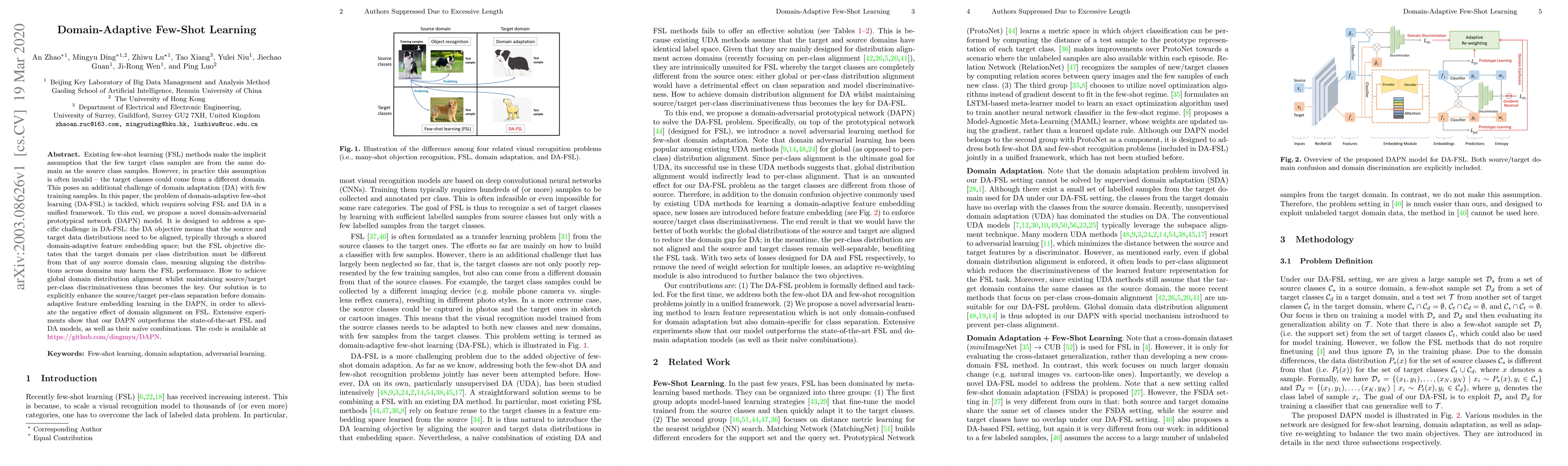 This paper addresses the challenge of domain-adaptive few-shot learning (DA-FSL) by proposing a novel domain-adversarial prototypical network (DAPN) that aligns source and target data distributions while maintaining per-class discriminativeness. The DAPN enhances class separation before domain-adaptive feature embedding, achieving better performance than state-of-the-art FSL and DA models.