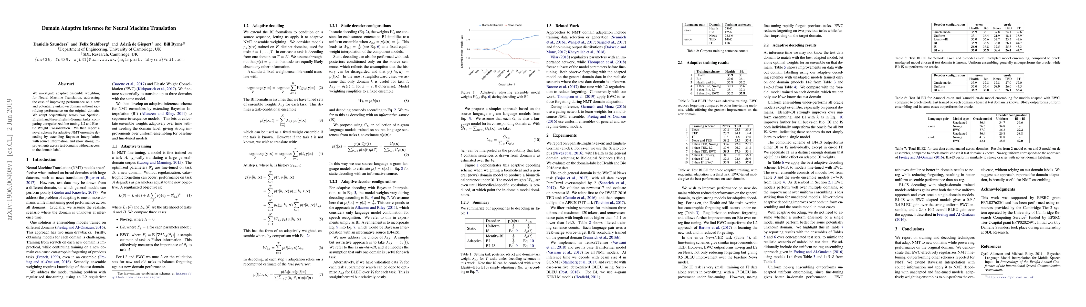 We investigate adaptive ensemble weighting for Neural Machine Translation, addressing the case of improving performance on a new and potentially unknown domain without sacrificing performance on the original domain. We adapt sequentially across two Spanish-English and three English-German tasks, comparing unregularized fine-tuning, L2 and Elastic Weight Consolidation. We then report a novel scheme for adaptive NMT ensemble decoding by extending Bayesian Interpolation with source information, and show strong improvements across test domains without access to the domain label.
